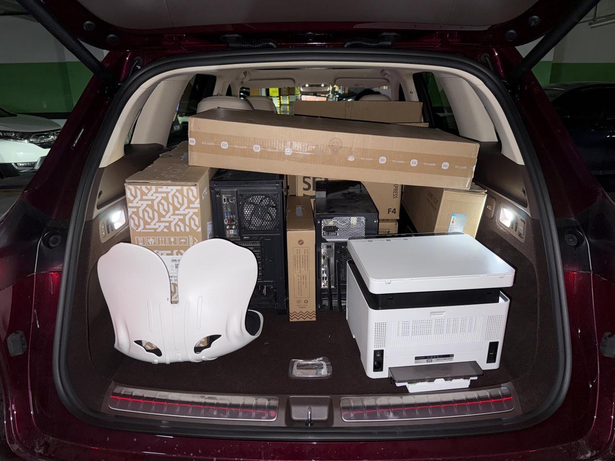 八个纸箱子,两台电脑机箱,一个打印机,以及其他零碎物。公司搬家刚好用全新问界M7
