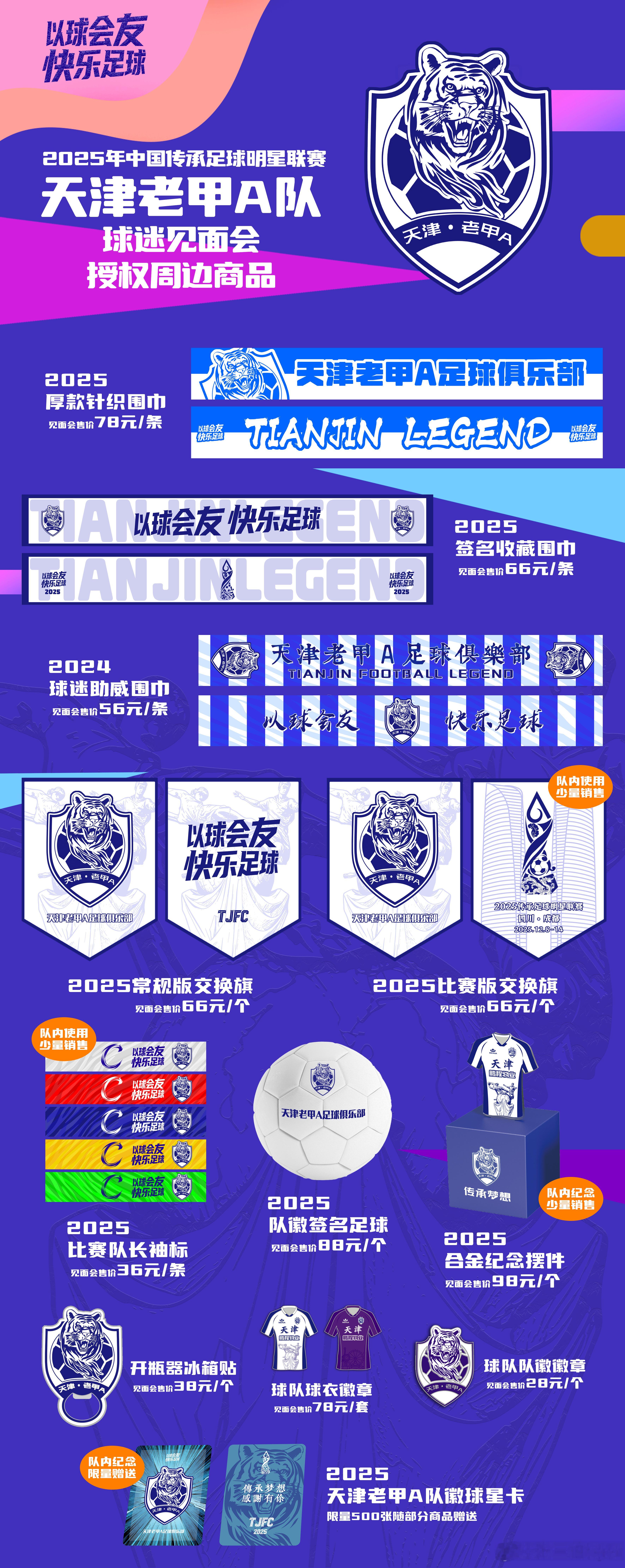 【天津老甲A】2025传承足球明星联赛天津老甲A队出征仪式暨球迷见面签售活动,明天下午两点,在西青区正道体育公园举行。今年老甲A新款周边产品在中午十二点左右就开始现场销售,大家可以早点来先购买周边等待签售活动。球迷无需报名,想来都能来。本次新品包括新赛季球衣徽章、限量纪念摆件、新款签名足球、新款签名围巾、新款针织围巾等,现场售卖周边数量有限,几乎都是一百以内的数量,所以早到早得。后期余量或补货会在佳智文化淘宝店铺线上销售。另外,今年的比赛服将在比赛期间由梅花销售,明天现场没有销售。⚠️大家注意导航正道体育公园,不是正道体育中心,别走错了。中国传承足球明星联赛 以球会友 快乐足球 天津老甲a 天津·天津正道体育公园