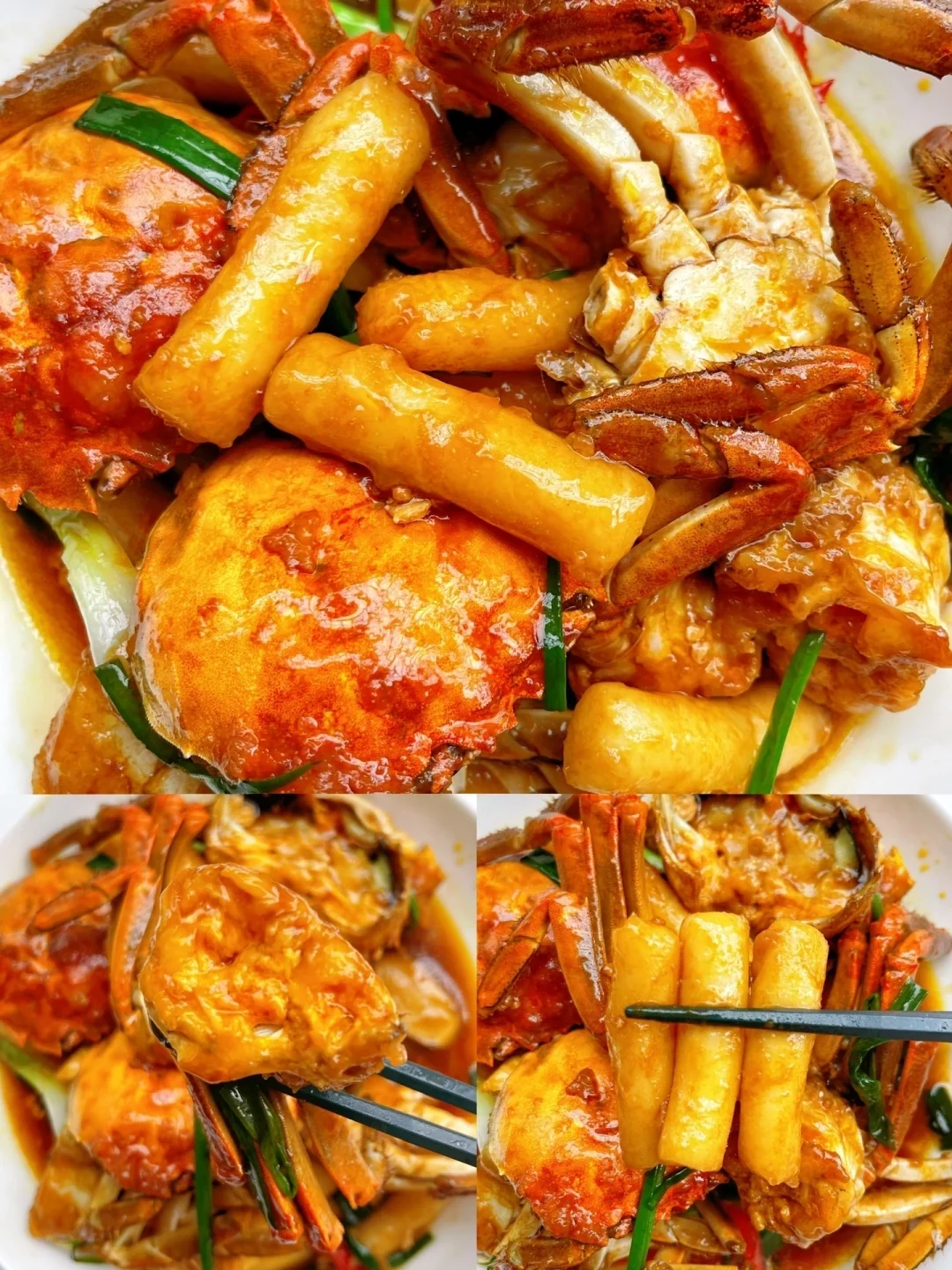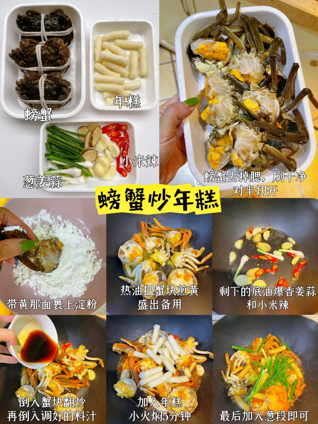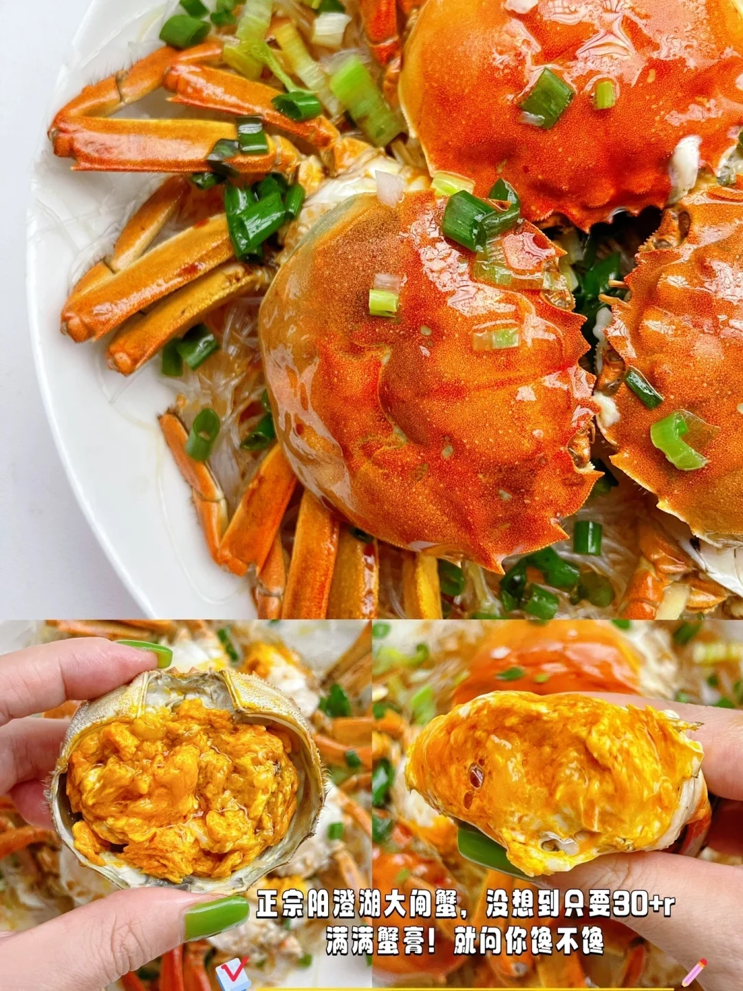 🦀️秋日的第一口螃蟹你吃了吗? 今天分享2⃣️种螃蟹做法!这样做蟹有料到吃完还想吃,收藏起来在中秋大展身手吧~ 1⃣️【螃蟹炒年糕】 📝材料:大闸蟹,年糕,姜葱蒜,小米辣 【做法】: ✅螃蟹去腮,刷干净,对半砍开,带黄那面裹淀粉 ✅热锅热油,把裹了面粉那面朝下煎黄,盛出备用 ✅用锅里底油爆香姜蒜小米辣,倒入螃蟹翻炒 ✅调个料汁:1茶匙盐+1茶匙糖+2勺生抽+1勺蚝油+半碗水,倒入锅中,再加入年糕,中小火焖煮5分钟,最后撒入葱段即可👌 2⃣️【葱油螃蟹】 📝材料:大闸蟹,粉丝,姜葱 做法参考图片,超简单,有手都会做[赞R] 🦀️秋天的第一顿大闸蟹,论有料还得是沃尔玛! 买了阳澄湖大闸蟹,蟹黄多到爆! 包有黄有膏,包足斤足两! [斜眼R]还顺便买了些月饼水果啥的,皮薄馅足,品类丰富啥都有[赞R][赞R][赞R] 中秋送礼稳稳拿捏了!