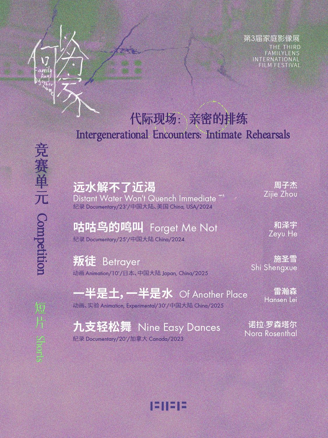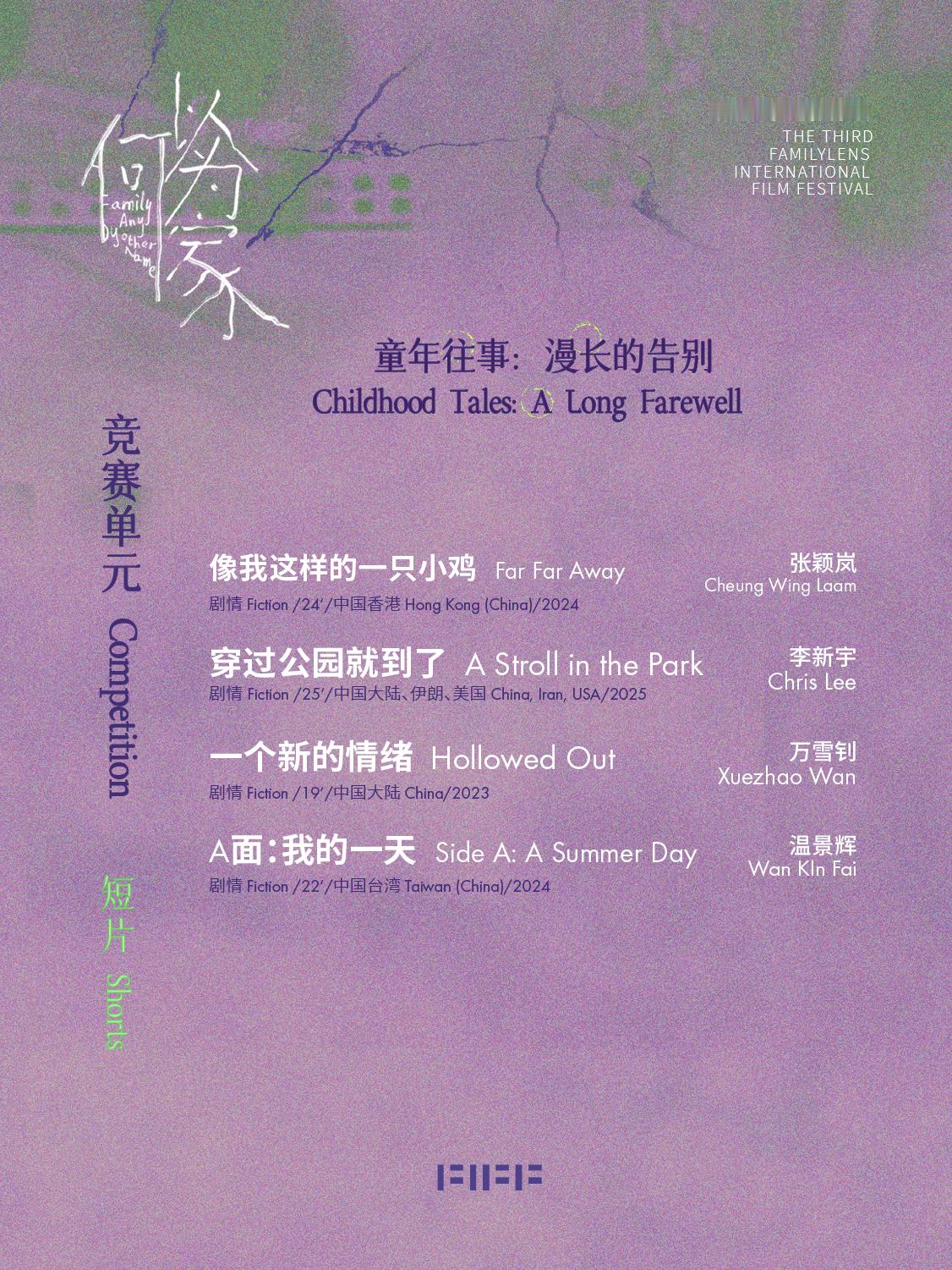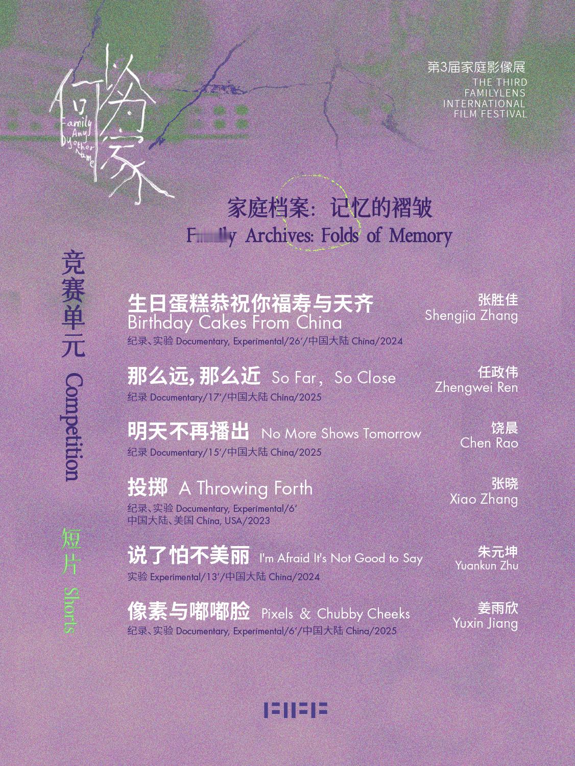 第三届家庭影像展FIFF明日正式开幕!「家」从不是固定的空间,而是持续生长的关系,藏在人与人彼此凝望的目光里、言语的沉静中、日常的往复间,亲密与疏离相伴,依靠与对峙共生。「何以为家」本届家庭影像展共有38部影片入围竞赛单元,共同勾勒关于“家”的多重形态与思想地图。🎦主竞赛单元:📌长片:共7部📌短片:家庭档案:记忆的褶皱 6部童年往事:漫长的告别 4部女性茧房:缠绕与阵痛 6部代际现场:亲密的排练 5部漫游实验:徘徊的坐标 6部路上的家:流动与安放 4部🎦影展特别策划四大主题展映:焦点影人:张大磊国际策展单元:意大利重构家庭影像回顾青少年影像单元公益影像单元12月6日—14日·北京关注 让我们在电影里,开启一段家庭旅行。