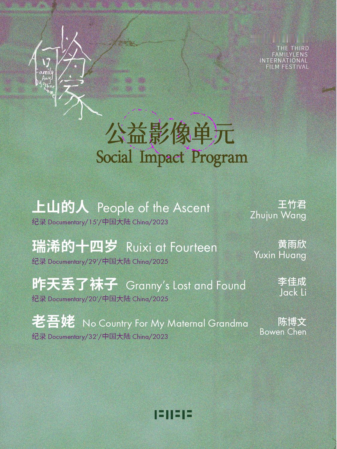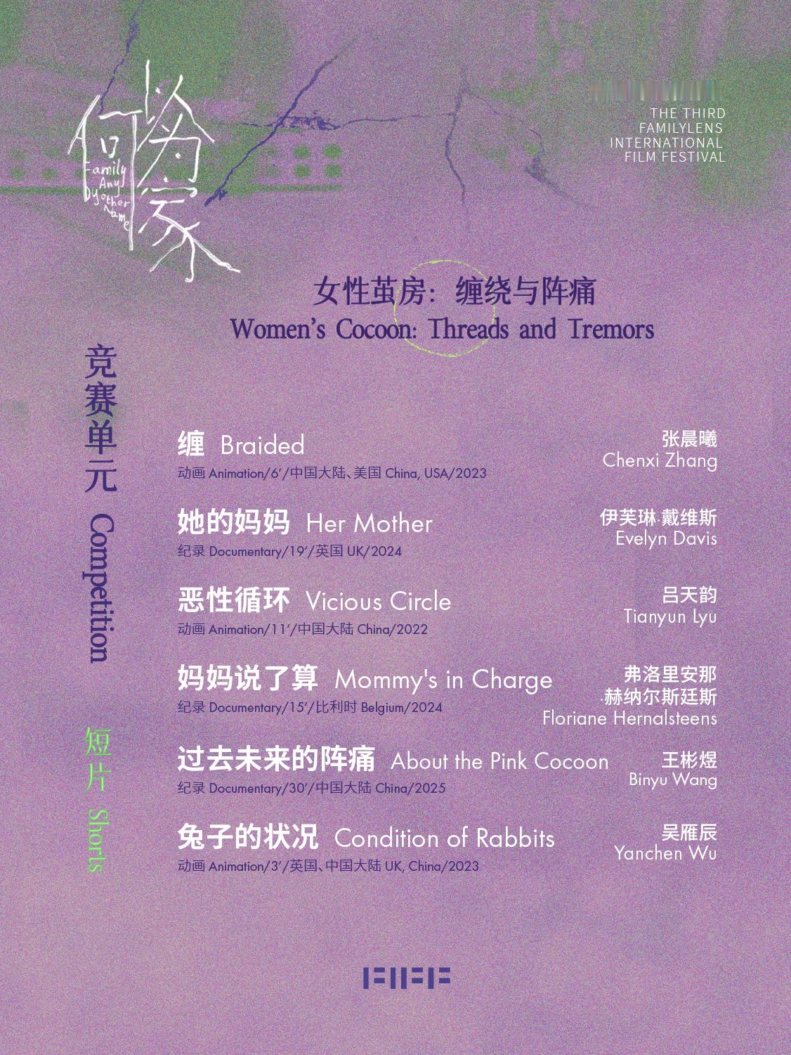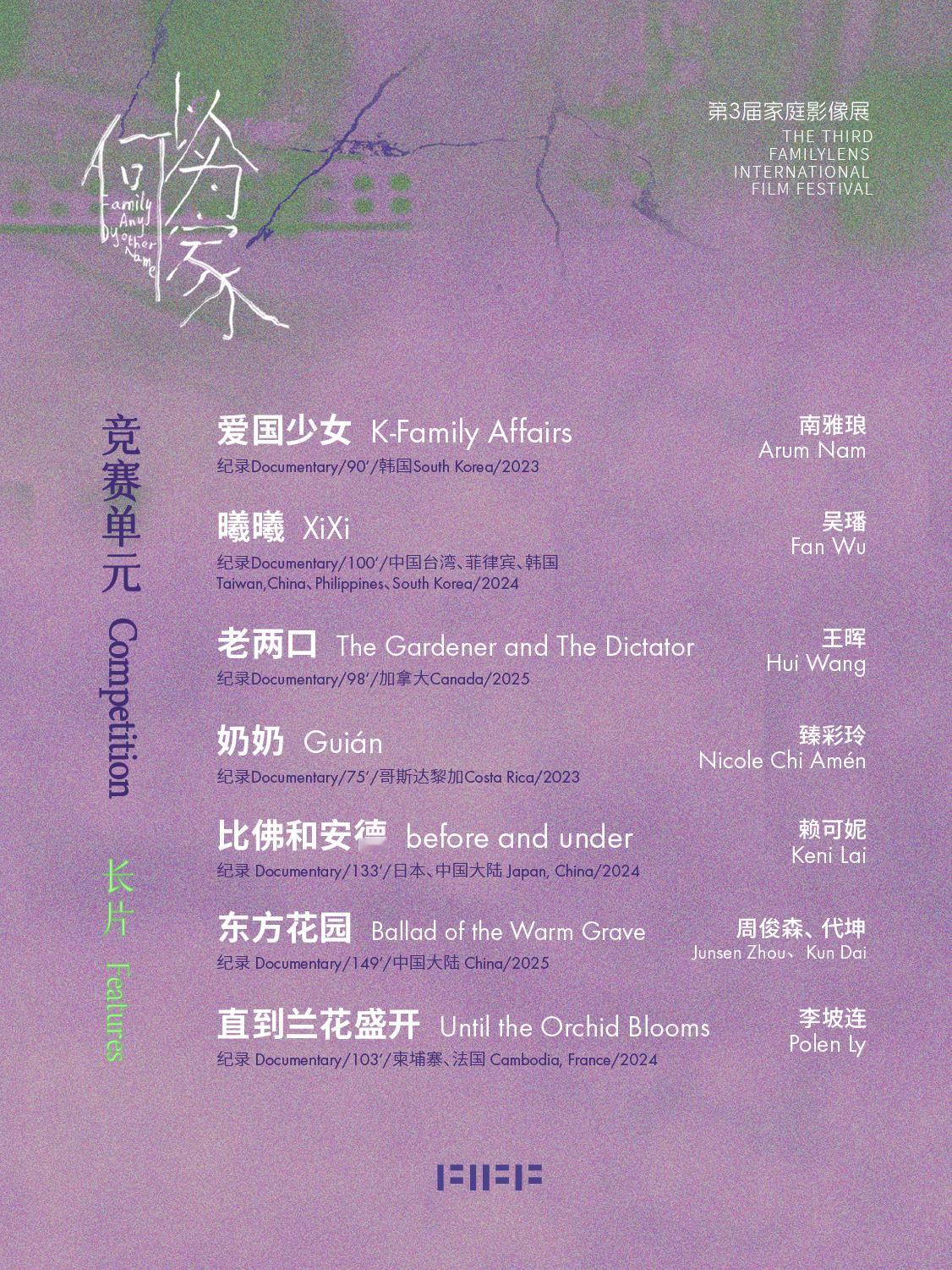 第三届家庭影像展FIFF明日正式开幕!「家」从不是固定的空间,而是持续生长的关系,藏在人与人彼此凝望的目光里、言语的沉静中、日常的往复间,亲密与疏离相伴,依靠与对峙共生。「何以为家」本届家庭影像展共有38部影片入围竞赛单元,共同勾勒关于“家”的多重形态与思想地图。🎦主竞赛单元:📌长片:共7部📌短片:家庭档案:记忆的褶皱 6部童年往事:漫长的告别 4部女性茧房:缠绕与阵痛 6部代际现场:亲密的排练 5部漫游实验:徘徊的坐标 6部路上的家:流动与安放 4部🎦影展特别策划四大主题展映:焦点影人:张大磊国际策展单元:意大利重构家庭影像回顾青少年影像单元公益影像单元12月6日—14日·北京关注 让我们在电影里,开启一段家庭旅行。
