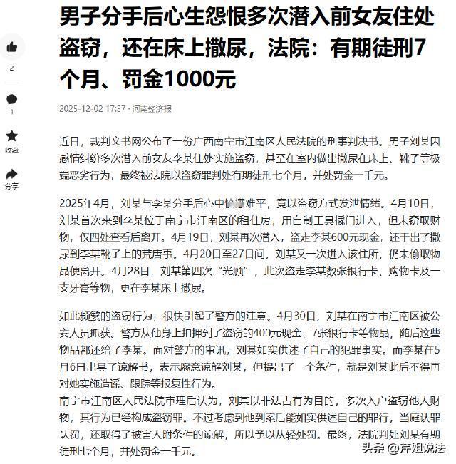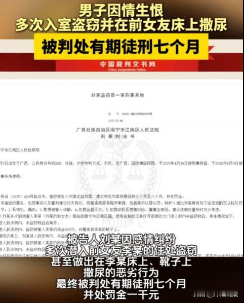 广西南宁,一男子刘某和女友李某因性格不合分手后怀恨在心,一心想要报复。他先造谣李某私生活混乱,又多次尾随跟踪。之后刘某三次潜入李某家,第一次没拿东西,第二次偷走600元现金还在鞋里尿尿,第三次拿走多张银行卡等物品并在床上尿尿。李某忍无可忍报警,刘某很快被抓。李某出具谅解书,可刘某还是被检方以涉嫌盗窃罪提起公诉,法院判了。 (信息来源:裁判文书网、河南经济报) 刘某和李某原本是一对情侣,两人相处一段时间后,因性格差异,生活中常常因为一些小事就争吵不断。 这种频繁的争吵让李某身心俱疲,她觉得这样的感情实在无法继续下去,便向刘某提出了分手。 刘某一开始并没有意识到问题的严重性,等李某真的提出分手,他才后悔不已。 可这时候后悔已经晚了,李某心意已决。 刘某心里那股子气没处撒,就开始想方设法报复李某。 他先是在他们共同的朋友圈子里到处造谣,说李某私生活混乱,和很多男人有不正当关系。 这些谣言很快就在小圈子里传开了,给李某的名誉造成了极大的损害。 李某知道后,气得不行,可刘某还不罢休。 除了造谣,刘某还多次尾随跟踪李某。李某上班、下班、逛街,不管走到哪,都能感觉到背后有一双眼睛在盯着自己。 2025年4月10日,刘某心里的报复念头越来越强烈,他决定干一件大事。 他趁着李某不在家,撬开了李某家的门锁,第一次潜入了李某的家中。 进屋后,刘某心里又紧张又激动,他在屋子里转了一圈,看着熟悉又陌生的环境,最后什么也没拿就匆匆离开了。 这次入室没拿东西,并没有让刘某的报复心理得到满足。 4月19日,刘某又故技重施,再次撬开李某家的门锁潜入。 这一次,他在屋子里四处翻找,找到了600元现金,顺手就装进了自己的口袋。 这还不算完,刘某为了进一步发泄心中的怨恨,竟然在李某的鞋子里尿了尿,然后才得意洋洋地离开。 李某回到家,发现现金不见了,鞋子还有一股难闻的气味。 她心里大概猜到是刘某干的,可又没有证据,只能自己生闷气。 而刘某,看到李某没有报警,胆子变得更大了。 4月28日,刘某第三次潜入李某家。 这一次,他在屋子里翻得更仔细了,拿走了李某的多张银行卡等物品。 更过分的是,他还在李某的床上尿了尿,把床弄得一团糟。 李某回到家,看到眼前的景象,简直要崩溃了。 她再也忍受不了刘某的这种恶劣行为,报了警。 民警通过监控录像等线索,很快就锁定了刘某,并将其抓获。 刘某被抓后,李某念及两人曾经的感情,出具了谅解书,希望警方能从轻处理刘某。 可检方并没有因为李某的谅解书就放弃对刘某的起诉,还是以涉嫌盗窃罪将他提起了公诉。 刘某的行为是否构成盗窃罪,刘某觉得自己虽然做了这些事,但李某都谅解自己了,不应该被判这么重。 李某认为,刘某的行为已经严重影响了自己的生活,给自己造成了很大的伤害,虽然出具了谅解书,但刘某还是应该为自己的行为付出代价。 根据刑法规定,盗窃罪是指以非法占有为目的,盗窃公私财物数额较大或者多次盗窃、入户盗窃、携带凶器盗窃、扒窃的行为。 在这起案件中,刘某三次潜入李某家中,第一次虽然没有拿东西,但已经实施了入户的行为。 第二次偷走了600元现金,这属于盗窃公私财物。 第三次拿走了多张银行卡等物品,同样也是盗窃行为。 而且刘某是多次入户盗窃,完全符合盗窃罪的范畴。 李某出具的谅解书,在法律上有什么作用呢? 根据相关法律规定,对于犯罪情节轻微,取得被害人谅解的,可以依法从宽处理。 但这并不意味着有谅解书就可以免除刑事处罚。 刘某虽然取得了李某的谅解,但他多次入户盗窃,行为恶劣,对社会造成了一定的不良影响。 不过,刘某归案后如实交代了自己的犯罪事实,认罪态度较好,这也是可以从轻处罚的情节。 如果刘某第一次入室盗窃后就停止,还会被判这么重吗? 如果刘某第一次入室盗窃后就停止犯罪行为,没有后续的多次盗窃,那么他的犯罪情节相对较轻。 根据法律规定,可能会根据盗窃的金额等具体情况,判处相对较轻的刑罚。 最终法院判决刘某犯盗窃罪,判处有期徒刑7个月,罚金1000元。 感情的事本就复杂,分手后更应该好聚好散。 刘某因为一时的不甘和怨恨,采取极端手段报复,最终让自己受到了法律的制裁。