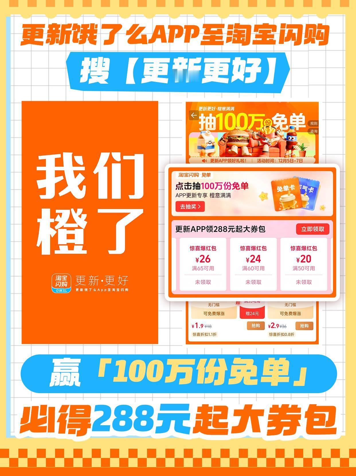 升级饿了么APP至淘宝闪购真的橙饿了么APP更新为淘宝闪购整个活动是有心机的,先是上一墙的蓝色盲盒,让咱闻着味儿就去抽了,听说除了周边小礼物,还有机会抽到Iphone、戴森吹风机、宝利来相机等超级大礼!抽着抽着,露出来橙色的淘宝闪购了,就这样一起手动翻开了品牌新篇章了~还蛮会玩的嘛!而且更新饿了么APP至淘宝闪购,搜【更新更好】赢「100万份免单」,必得288元起大券包!人线上的福利也是没落下哦! 升级饿了么APP至淘宝闪购赢免单