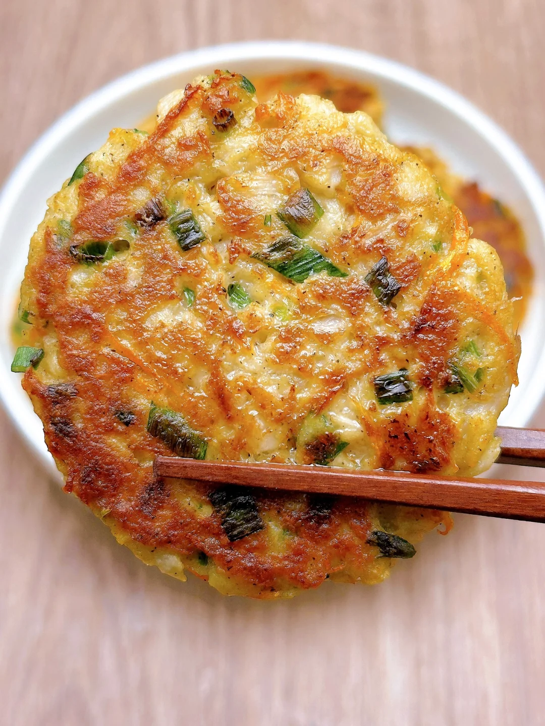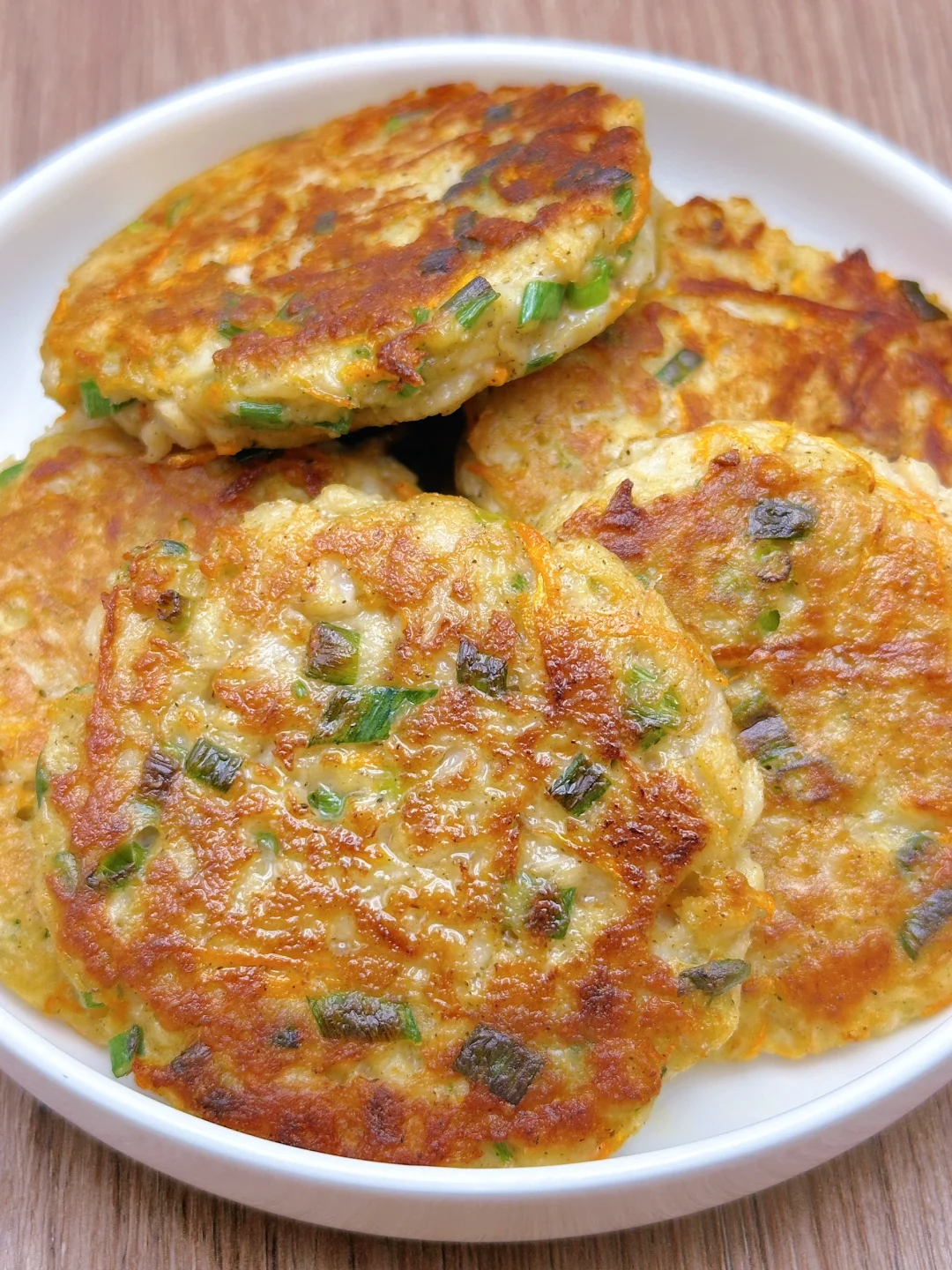 2️⃣取面糊摊成小饼,放热油锅里,最小火煎至两面金黄即可(第一面要煎久一点再翻面,不然容易碎)