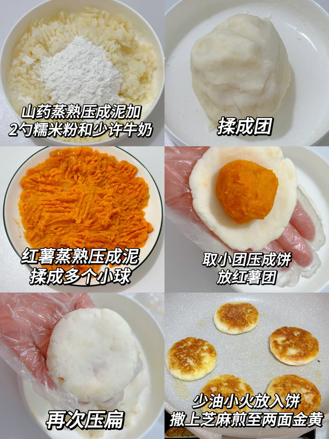2⃣️山药压成泥加入2勺糯米粉➕少许牛奶(加到不要太干即可、少量多次加)揉成团(不粘手)