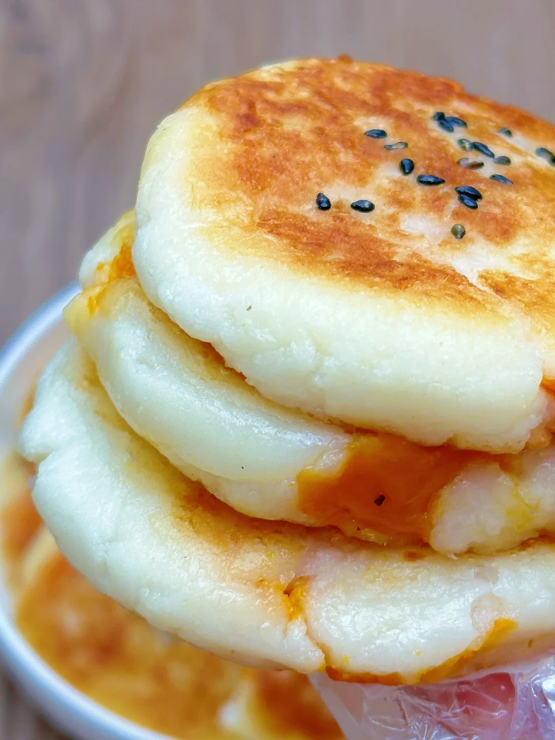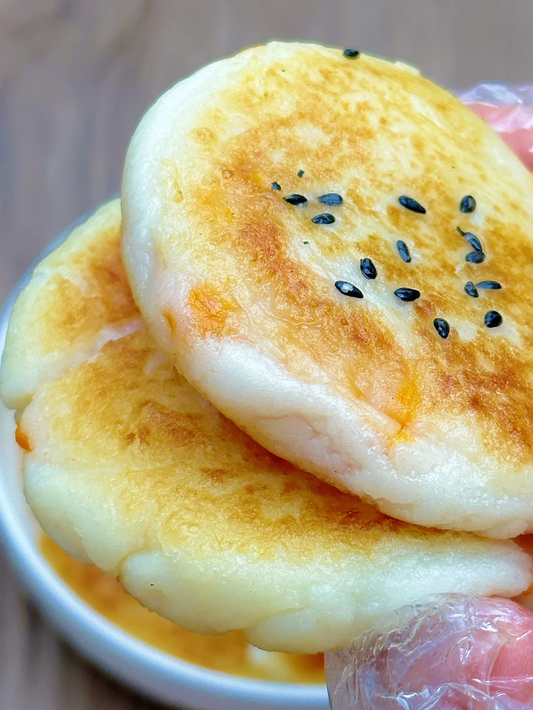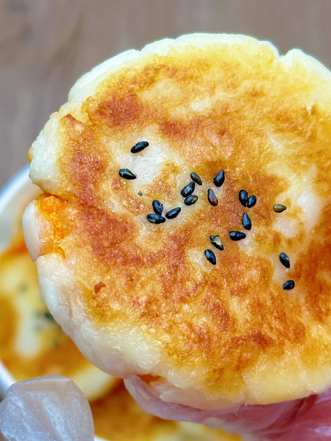 5⃣️锅里刷油最小火加放入饼,饼上上芝麻,煎至两面金黄即可开吃(第一面煎至2分钟左右再翻面哟)