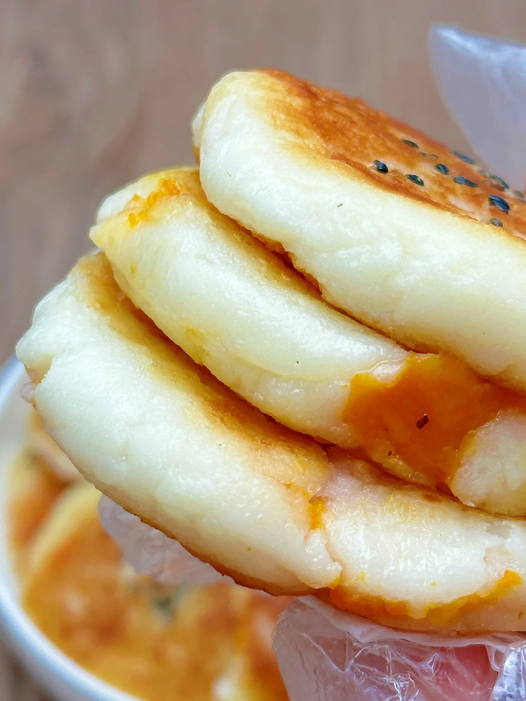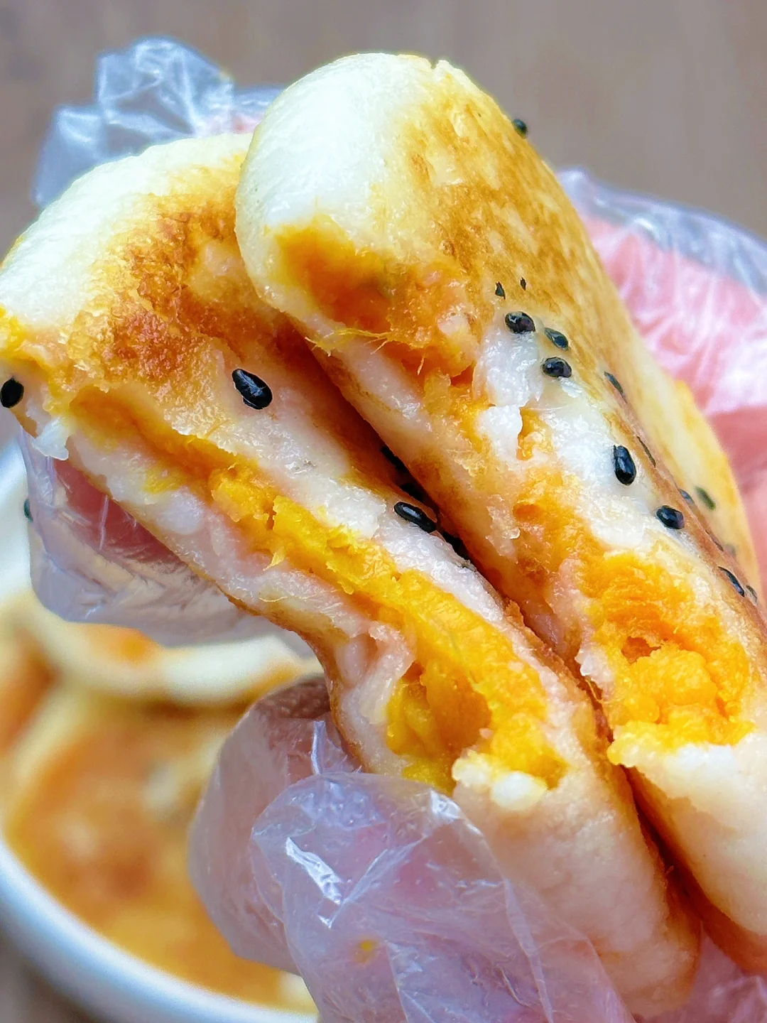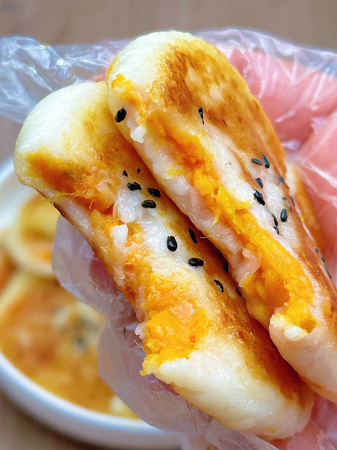 5⃣️锅里刷油最小火加放入饼,饼上上芝麻,煎至两面金黄即可开吃(第一面煎至2分钟左右再翻面哟)