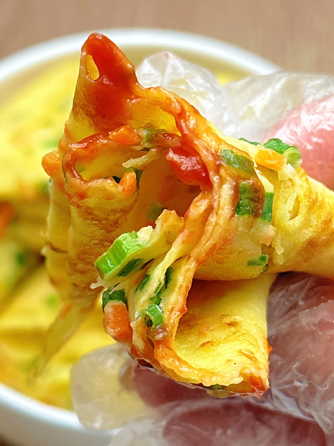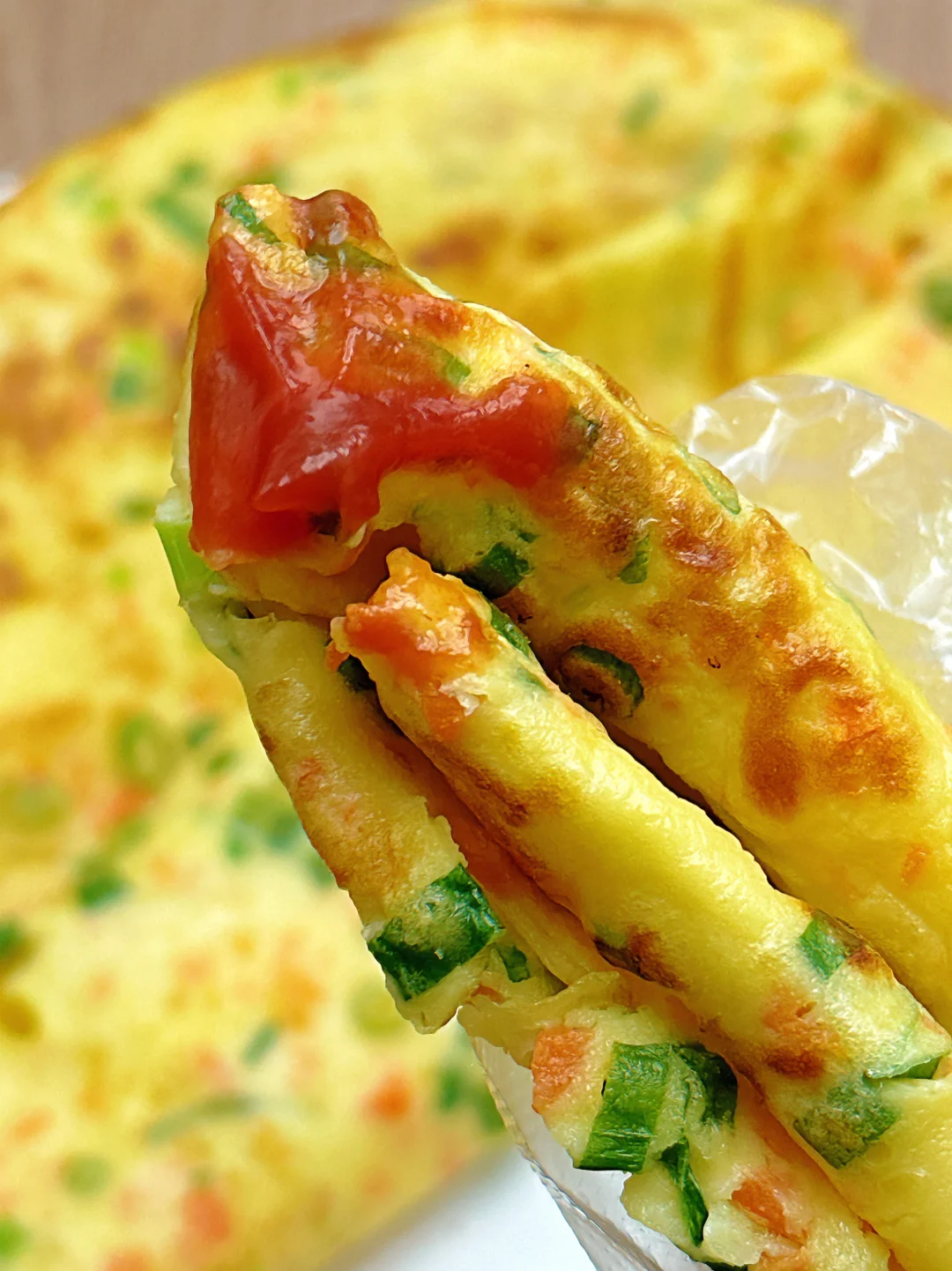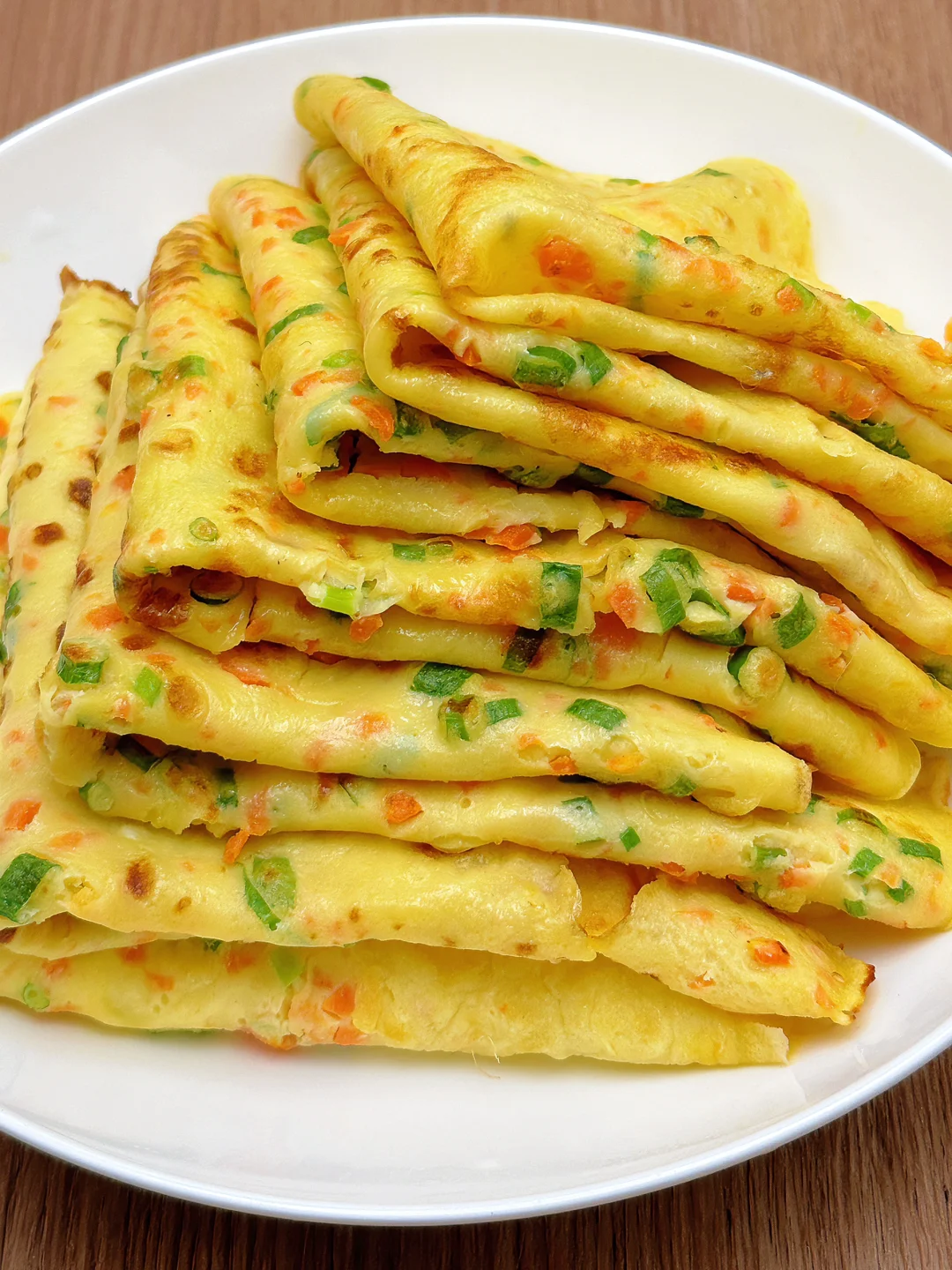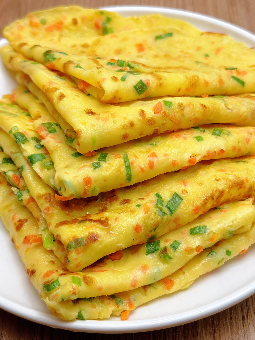 姐妹们,这个鸡蛋饼真的太好吃了,特别软乎,奶香和葱香都十足,老人小孩都爱吃的鸡蛋饼简单好做上手就会,不加一滴水,而且减脂期也能放心吃,一大块饼才70大卡,吃2块满满的饱腹感,姐妹们快去试试~
