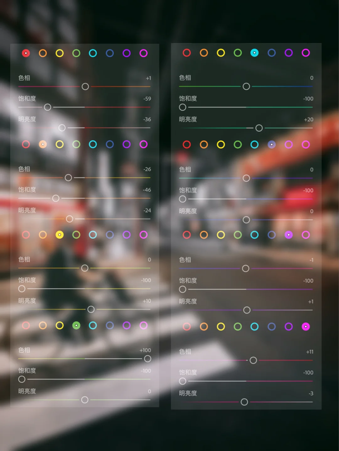 ☑ 调色思路是在HSL中保留红橙,降低其他所有色的饱和度,使得整体色调统一。降低高光,提亮阴影。