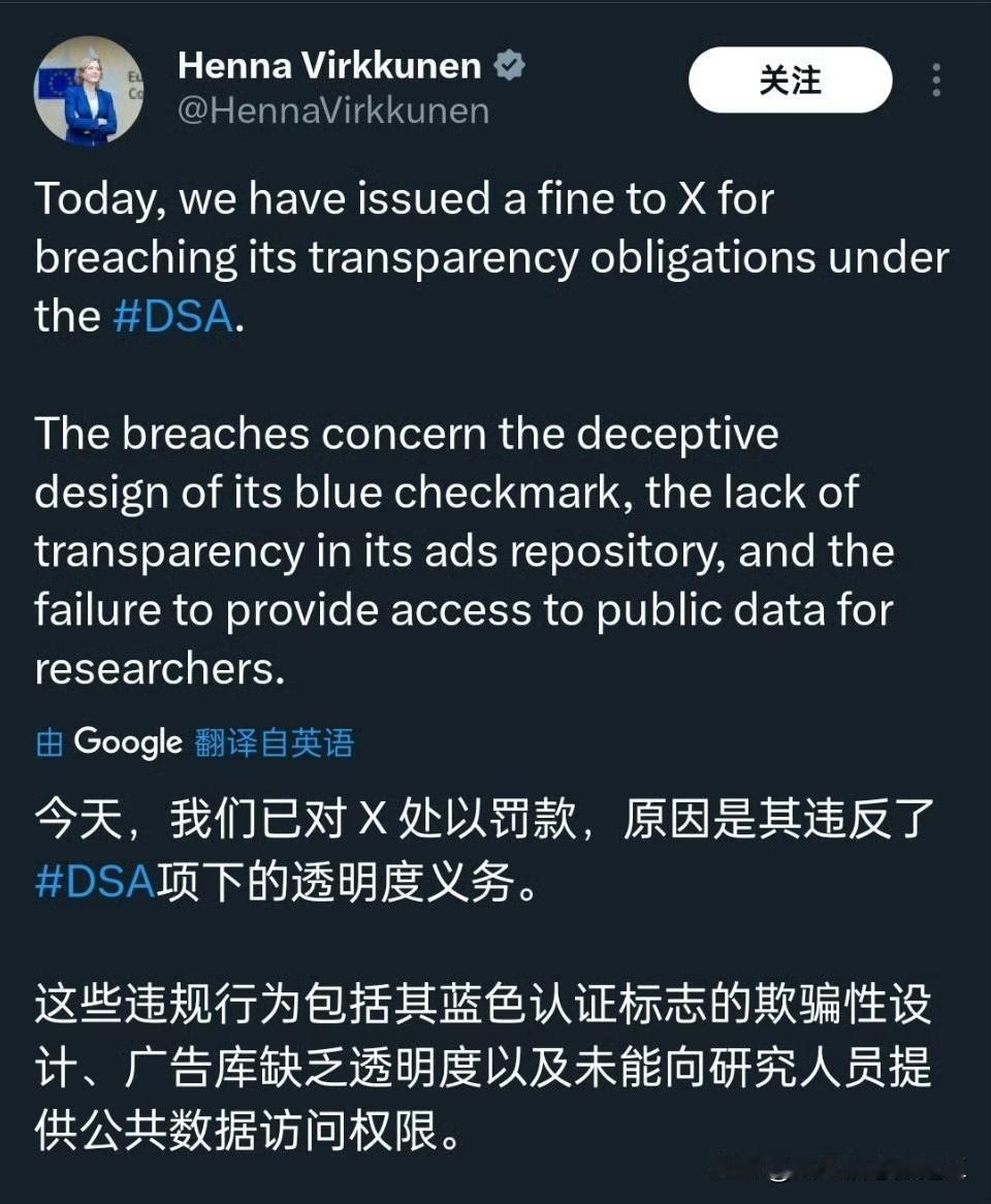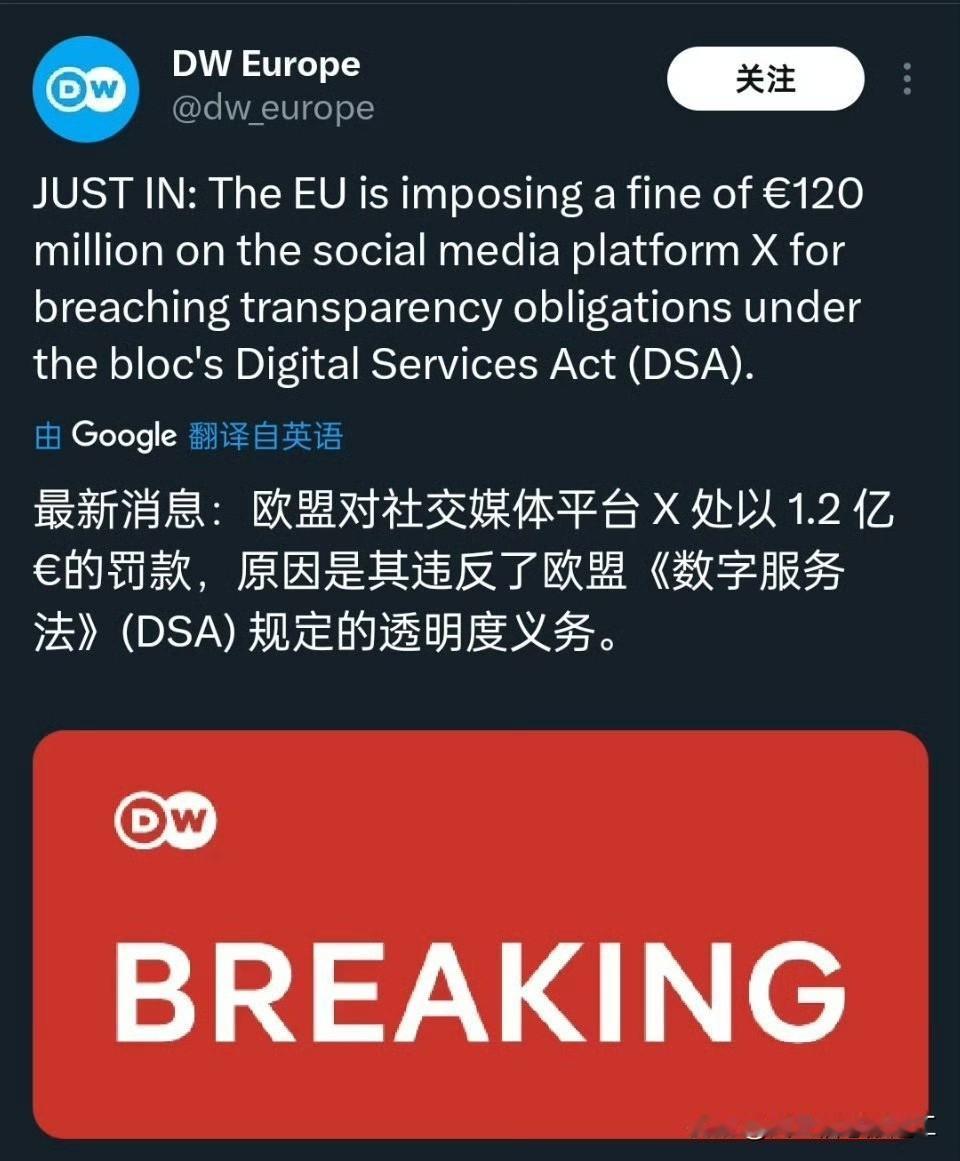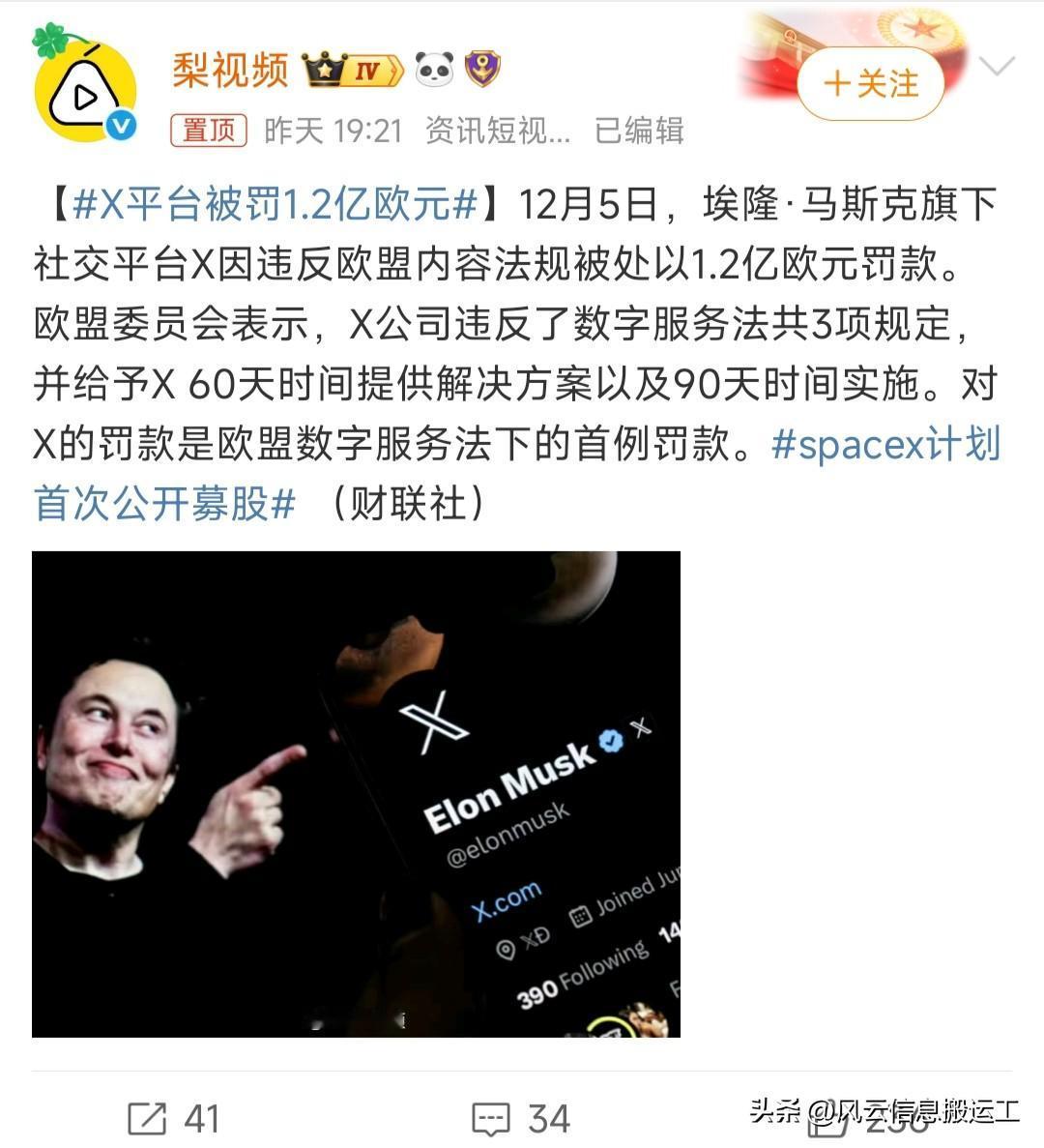 X平台被罚1.2亿欧元 欧盟对X平台罚款1.2亿欧元,理由是X平台违反了欧盟的透明度义务。