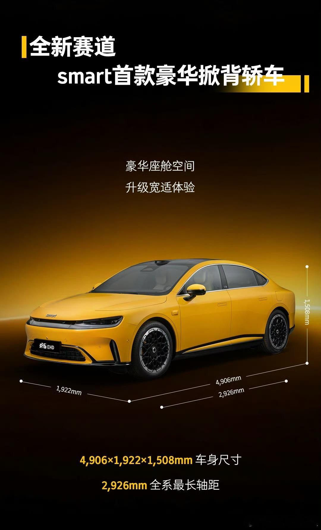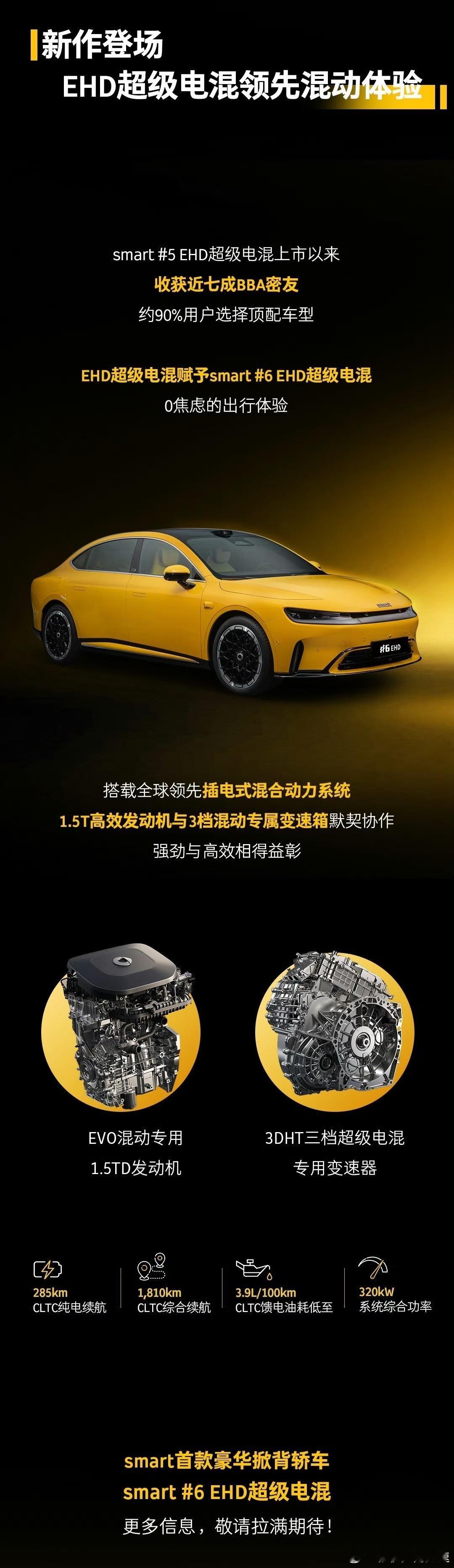 smart精灵6号公告图发布前阵子在路上等红灯 看见一台Smart精灵5号,媳妇儿还在感叹两点:1️⃣smart还在?2️⃣smart怎么不smart了?现在精灵6号要来了 中型掀背轿车 EHD超级电混这回看起来更不smart 但是不是销量上会有突破了?
