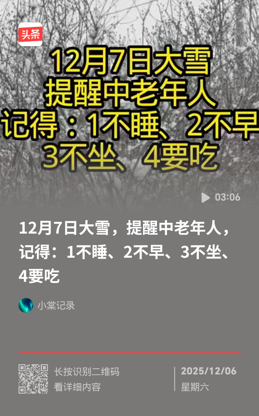 12月7日大雪“提前报到”!中老年人必看4个养生要点,安稳过冬不遭罪 12月7日05时04分大雪节气正式到来,今年这雪来得格外早——农历十月十八就交节,比往年早了近半个月,老辈人说“早大雪冷嗖嗖”,接下来寒冬模式彻底开启,中老年人可得把养生提上日程! 顺应“冬藏”规律,熬夜坚决要戒掉。黑夜长、白昼短,23点前就得入睡,睡够7-8小时才够劲,熬夜耗阳气,容易感冒、关节疼。睡前用40℃温水泡15-20分钟脚,微微出汗就好,既能暖身又能助眠。 晨练别赶早!清晨寒气重还可能有雾霾,污染物飘在低空伤呼吸道,等太阳出来后的8-9点,或是下午4-5点再出门。选太极、慢走这类舒缓运动,别剧烈运动出大汗,不然阳气会跟着汗液跑,抵抗力反而下降。 户外千万别坐石凳子!“冬不坐石”是老规矩,石头冬天冰得刺骨,一坐就吸走身体热量,寒气还会钻进腰臀经络,加重腰腿痛、关节炎,出门带个便携坐垫才稳妥。 大雪是进补好时候,“冬天进补,开春打虎”这话不假。多吃鸡肉、羊肉、鱼虾这些高蛋白食物,清炖清蒸最滋补,既能抗寒又能增强免疫力,帮身体储备能量,舒舒服服过暖冬。 今年大雪早、寒意浓,中老年人照着这几点做,少生病、少遭罪,安稳过冬不用愁!入冬养生法 小雪三忌三宜 冬日健康禁忌 冬后养生
