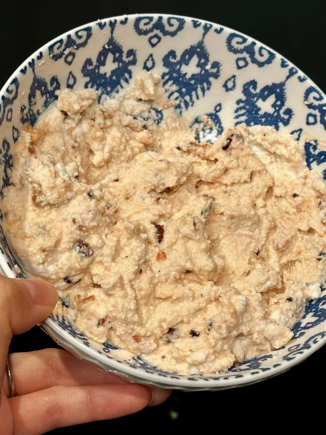 比例大概是3大勺ricotta配一小方块腐乳,可以再加一点腐乳汁调和质地。