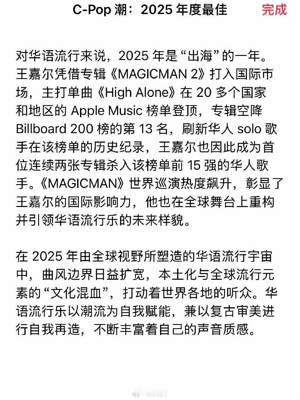 12月初的大惊喜非王嘉尔官宣世巡北美站 莫属了, 洛杉矶、奥克兰、温哥华、罗斯蒙特、布鲁克林、多伦多 6 城连唱,新专《MAGICMAN2》空降 Billboard200 第 13 名,刷新华人 solo 纪录,更是唯一连续两张专辑冲进前 15 的华人歌手,实力就是底气,巡演舞台值得所有期待✨!