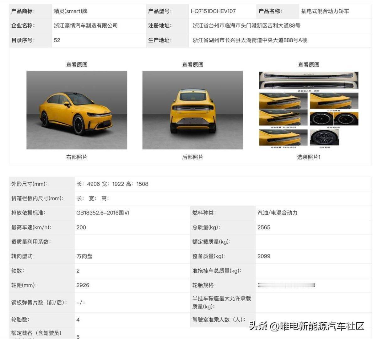 Smart精灵 smart精灵6号公告图发布如果你对smart的印象还停留在那个灵动小巧、穿梭城市的电动精灵,那么这辆最新的精灵6号2025年12月5日,工信部发布了《道路机动车辆生产企业及产品公告》(第402批),smart精灵 2025年12月5日,工信部发布了《道路机动车辆,smart精灵 6现身申报名单。12月6日,smart宣布精灵6号亮相工信部公告。 作为smart首款豪华掀背轿车,精灵6号车身尺寸为4906×1922×1508mm,轴距2926mm。新车由梅赛德斯-奔驰全球设计团队打造,沿用“感性·灵锐”设计哲学,采用动感十足的掀背设计,尾部配备多档位电动尾翼,配合修长有力的车身线条,兼具优雅气质与运动姿态。动力方面,精灵6号搭载EHD超级电混系统,由1.5T高效发动机与3DHT组成,综合续航里程达到1810km。大v聊车