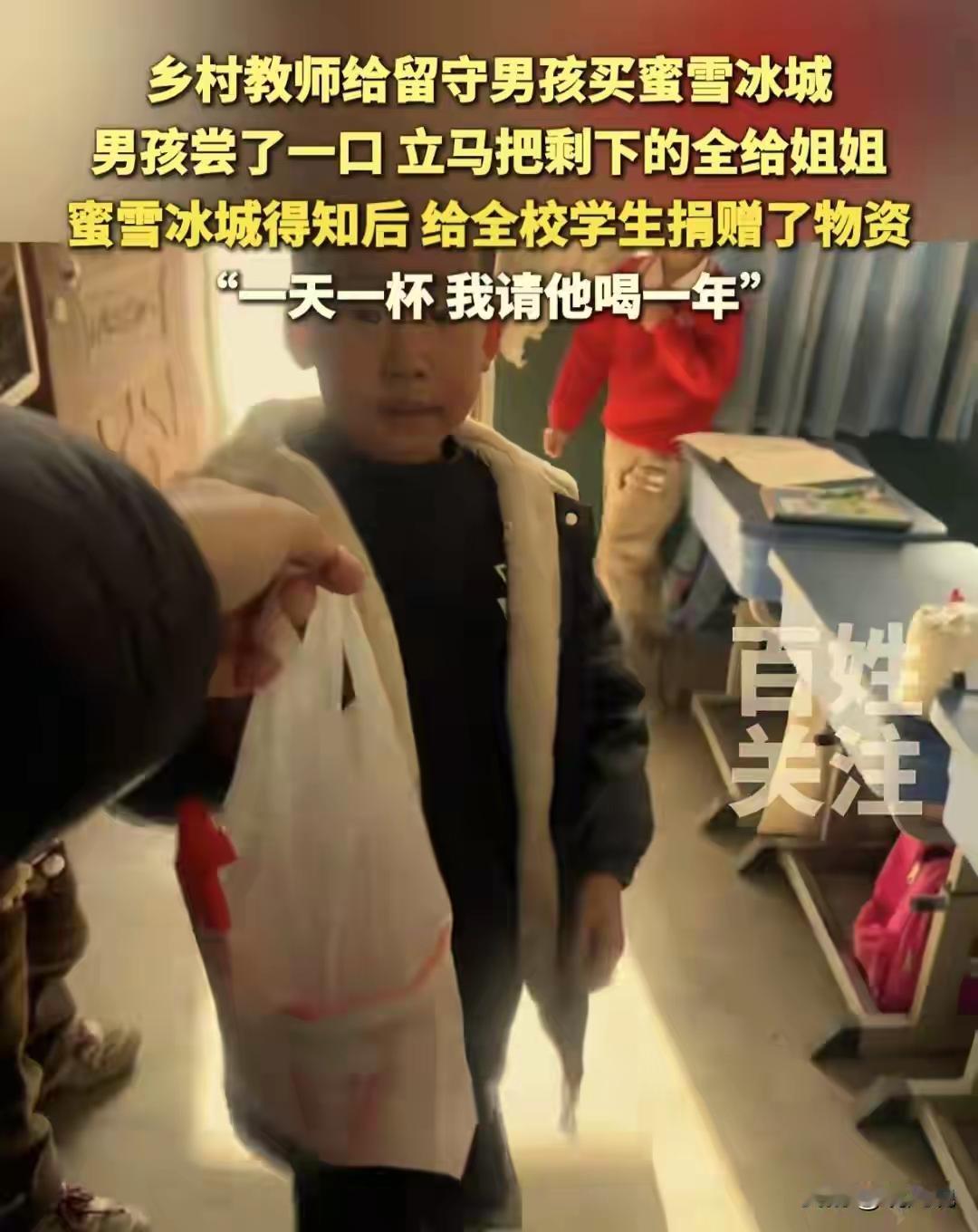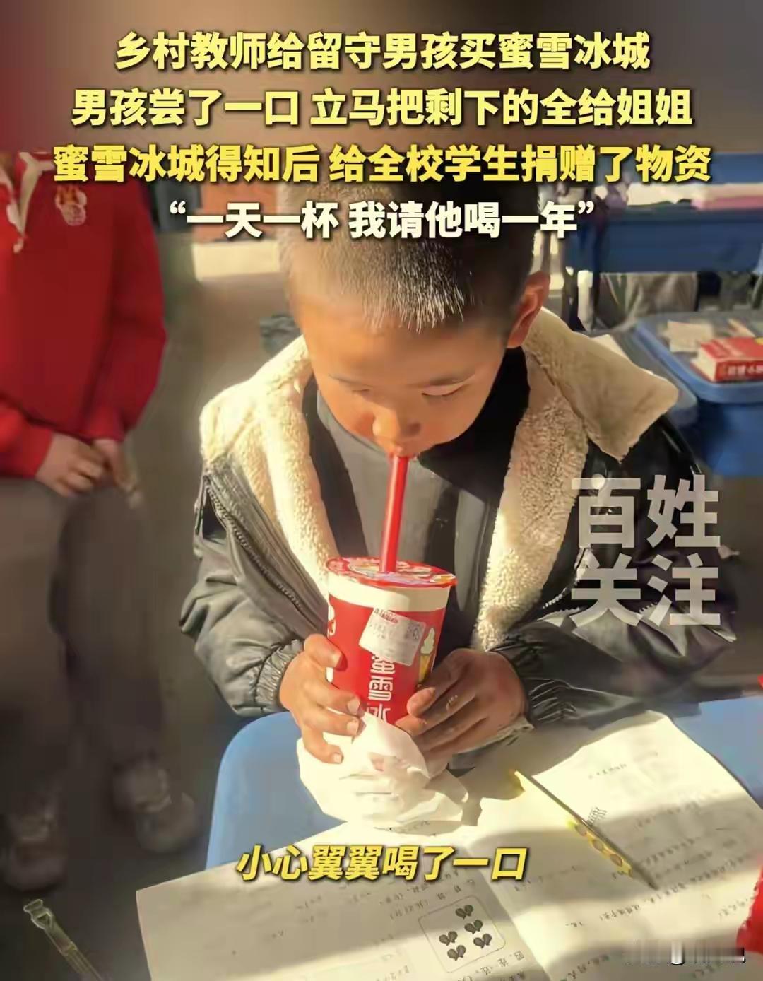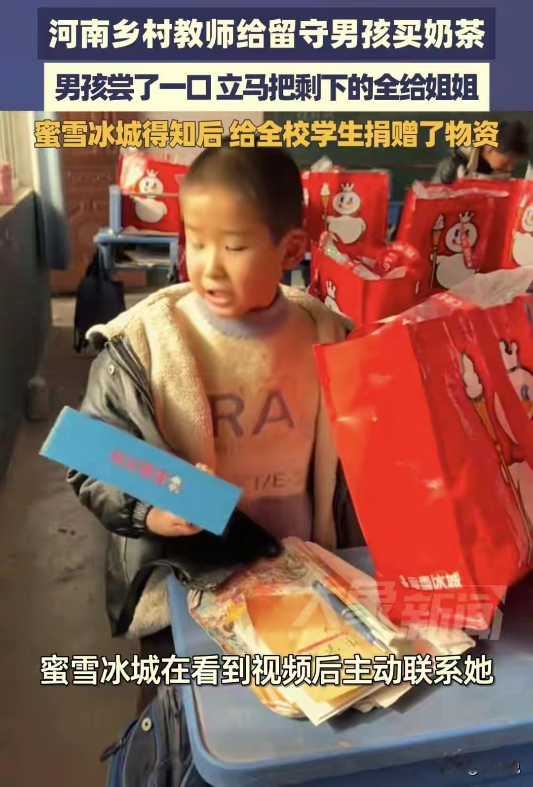 这不是捧吹人家的蜜雪冰城,在别的高端饮品,还在高端市场上针对的人群精致的人群,而蜜雪的定位定位人群,则是人民,谁能够想得出,一个平价亲民的奶茶品牌,竟然在内心留存着最温柔的一面。 事情是发生在河南周口的特岗老师七七,这位老师可真不容易,作为一位老师总是把孩子的小心愿放这在自己的心中,而这一次的小愿望也是轮到了9岁的留守儿童小辰。 农村孩子的愿望就是这么的简简单单,孩子就是想喝蜜雪冰城,就这么简单的愿望成为了孩子们内心最渴望的梦,这位老师也是深深的记了下来,于是在中午孩子午休的时候,老师独自一人去了5公里外的镇上买回了奶茶。可是小辰仅仅喝了一小口,就拿着杯子走向了校门口,为了就是能够分给三年级的姐姐。 在老师发布这视频之后,真没想想到,蜜雪冰城竟然会主动联系老师,联系的后续,可想而知,隔天,雪王就带着满车的物资走进了校园。各种毛绒玩具,和热奶茶都送到了这群孩子的手上。 对于小辰同学的奶茶愿望,有加盟商表示小辰姐弟的奶茶他们会请他们喝一年。真不敢相信,这已经不是蜜雪冰城的第一次善举。国内外各种困难,他始终是把公益当做第一,虽然是简简单单的一杯奶茶,但是蜜雪冰城把温暖送到了孩子的温暖,温暖着我们的心。