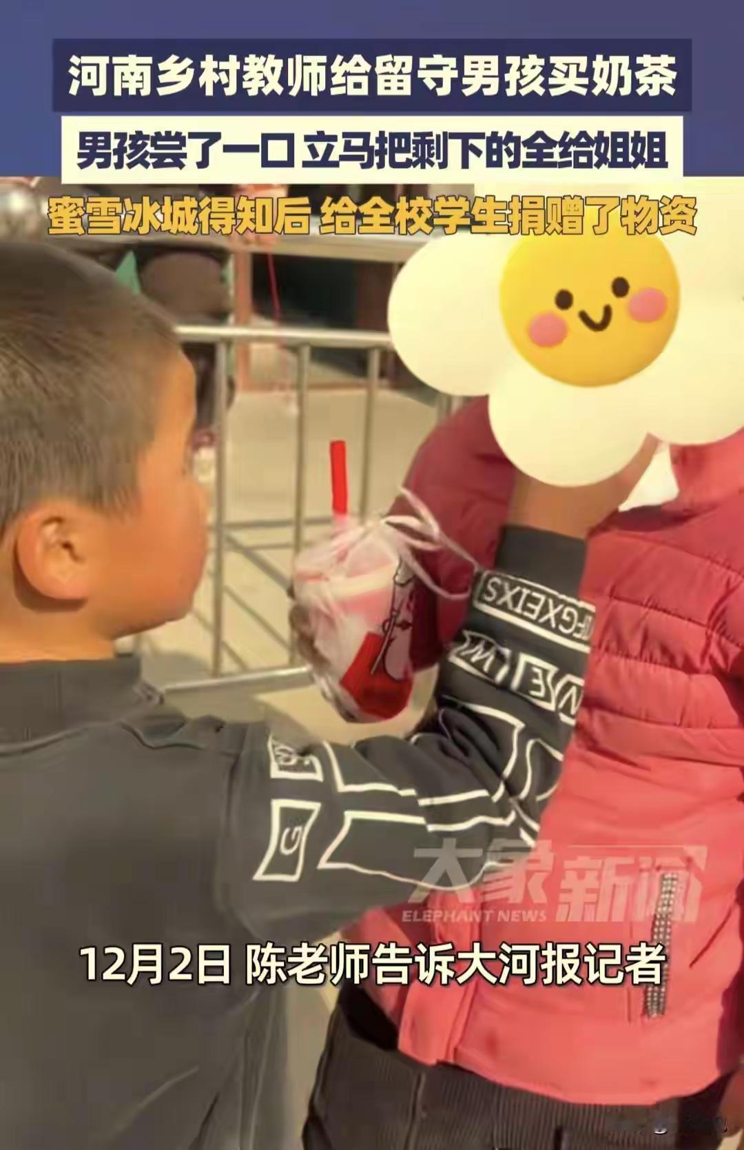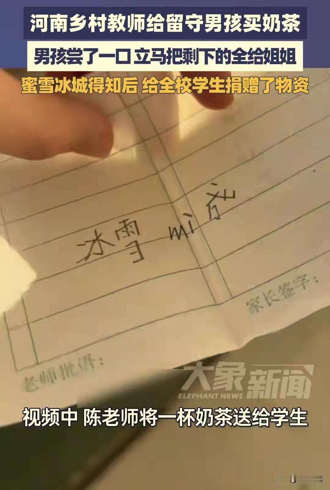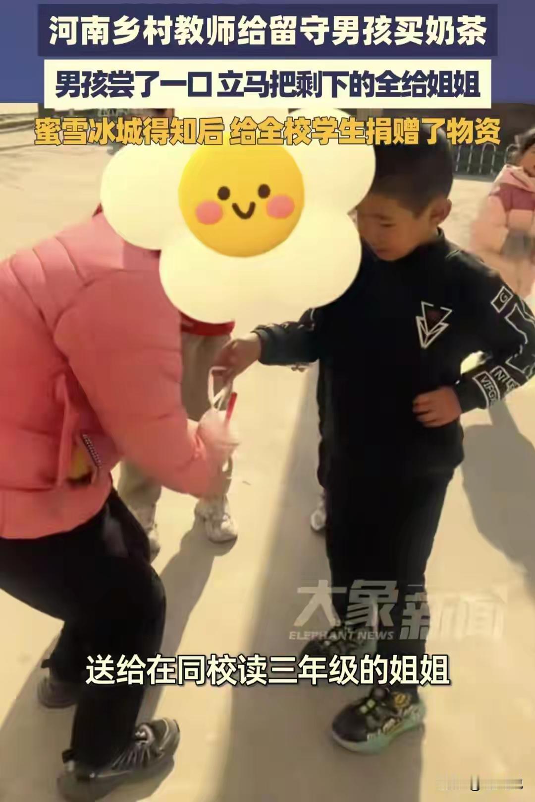 这不是捧吹人家的蜜雪冰城,在别的高端饮品,还在高端市场上针对的人群精致的人群,而蜜雪的定位定位人群,则是人民,谁能够想得出,一个平价亲民的奶茶品牌,竟然在内心留存着最温柔的一面。 事情是发生在河南周口的特岗老师七七,这位老师可真不容易,作为一位老师总是把孩子的小心愿放这在自己的心中,而这一次的小愿望也是轮到了9岁的留守儿童小辰。 农村孩子的愿望就是这么的简简单单,孩子就是想喝蜜雪冰城,就这么简单的愿望成为了孩子们内心最渴望的梦,这位老师也是深深的记了下来,于是在中午孩子午休的时候,老师独自一人去了5公里外的镇上买回了奶茶。可是小辰仅仅喝了一小口,就拿着杯子走向了校门口,为了就是能够分给三年级的姐姐。 在老师发布这视频之后,真没想想到,蜜雪冰城竟然会主动联系老师,联系的后续,可想而知,隔天,雪王就带着满车的物资走进了校园。各种毛绒玩具,和热奶茶都送到了这群孩子的手上。 对于小辰同学的奶茶愿望,有加盟商表示小辰姐弟的奶茶他们会请他们喝一年。真不敢相信,这已经不是蜜雪冰城的第一次善举。国内外各种困难,他始终是把公益当做第一,虽然是简简单单的一杯奶茶,但是蜜雪冰城把温暖送到了孩子的温暖,温暖着我们的心。
