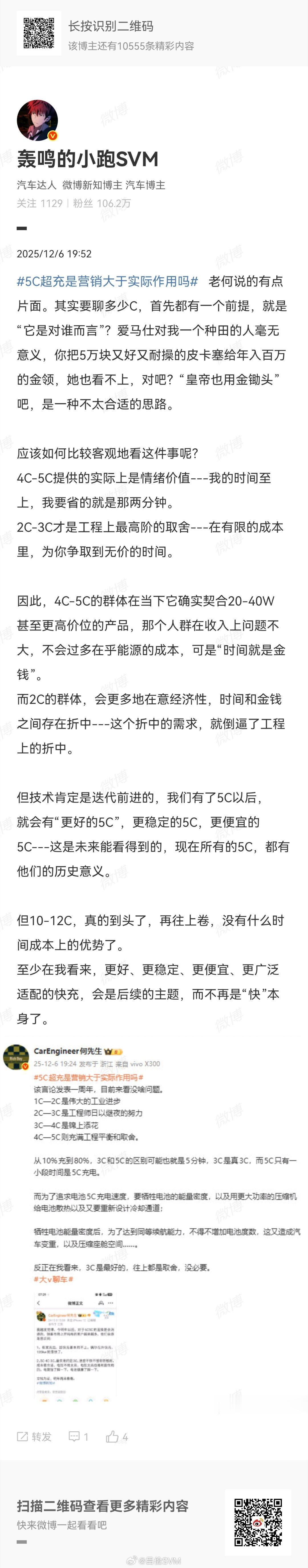 5C超充是营销大于实际作用吗感觉没必要特别口水仗几C,整体感受是新能源好用往更好用发展罢了。我这次从上海到保定再到张家口再回,差不多1500公里,进了小十几次次服务区。我发现有车没车功率基本都是100出头。所以你说5C技术好嘛,肯定是好的,但是真的离我很远… 但是换个角度看,基本都可以随时补能的,即便到了寒冷的北方 。所以,充电方便的话,新车前五年体验一定好过燃油车的。