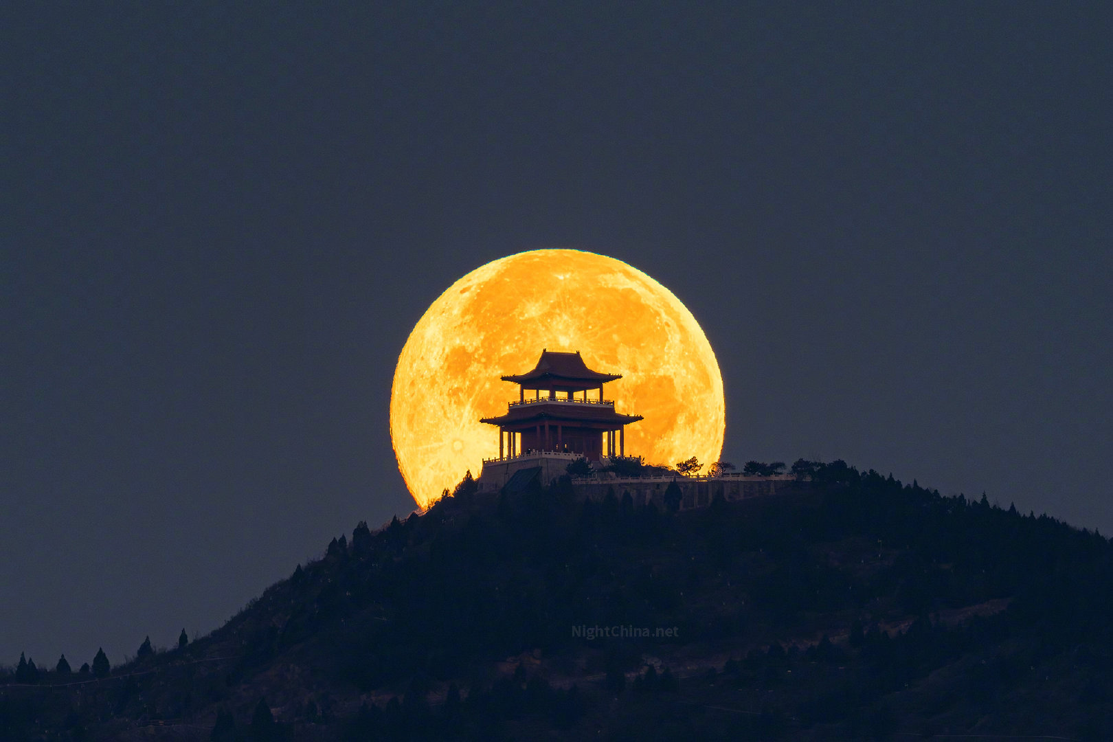 金轮西坠,檐角轻挑。当巨大的满月缓缓沉入紫光阁的飞檐斗拱之间,古建的肃穆与月色的温柔在此刻无声交融。 这一眼,便是独属于东方的极致浪漫。摄影师:,2025年12月5日摄于 河北 石家庄龙泉湖湿地公园。索尼A7R3 + 锐星103APO,ISO 100,f/5.4,曝光1/25秒。关注Steed的星空 ,每日推送星空佳作。更多图片请见 夜空中国 :NightChina.net