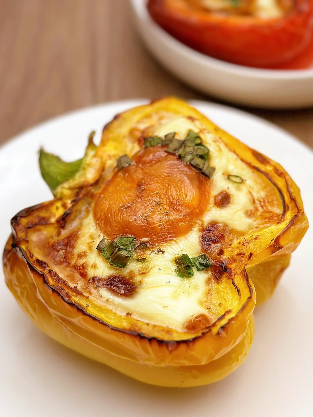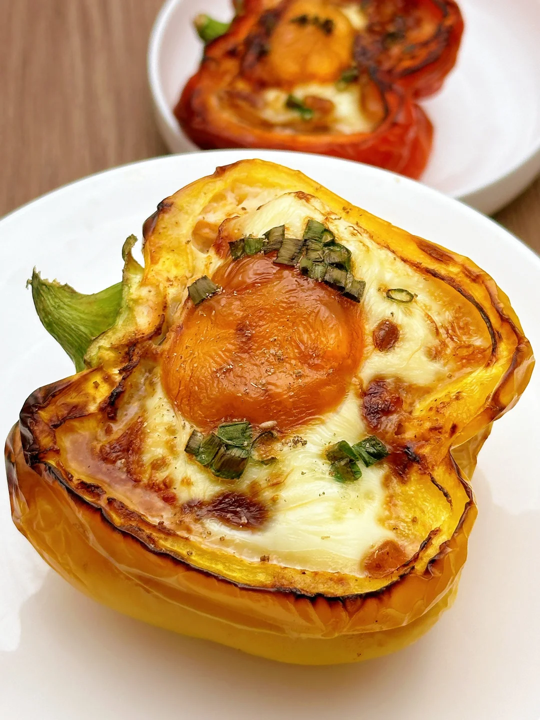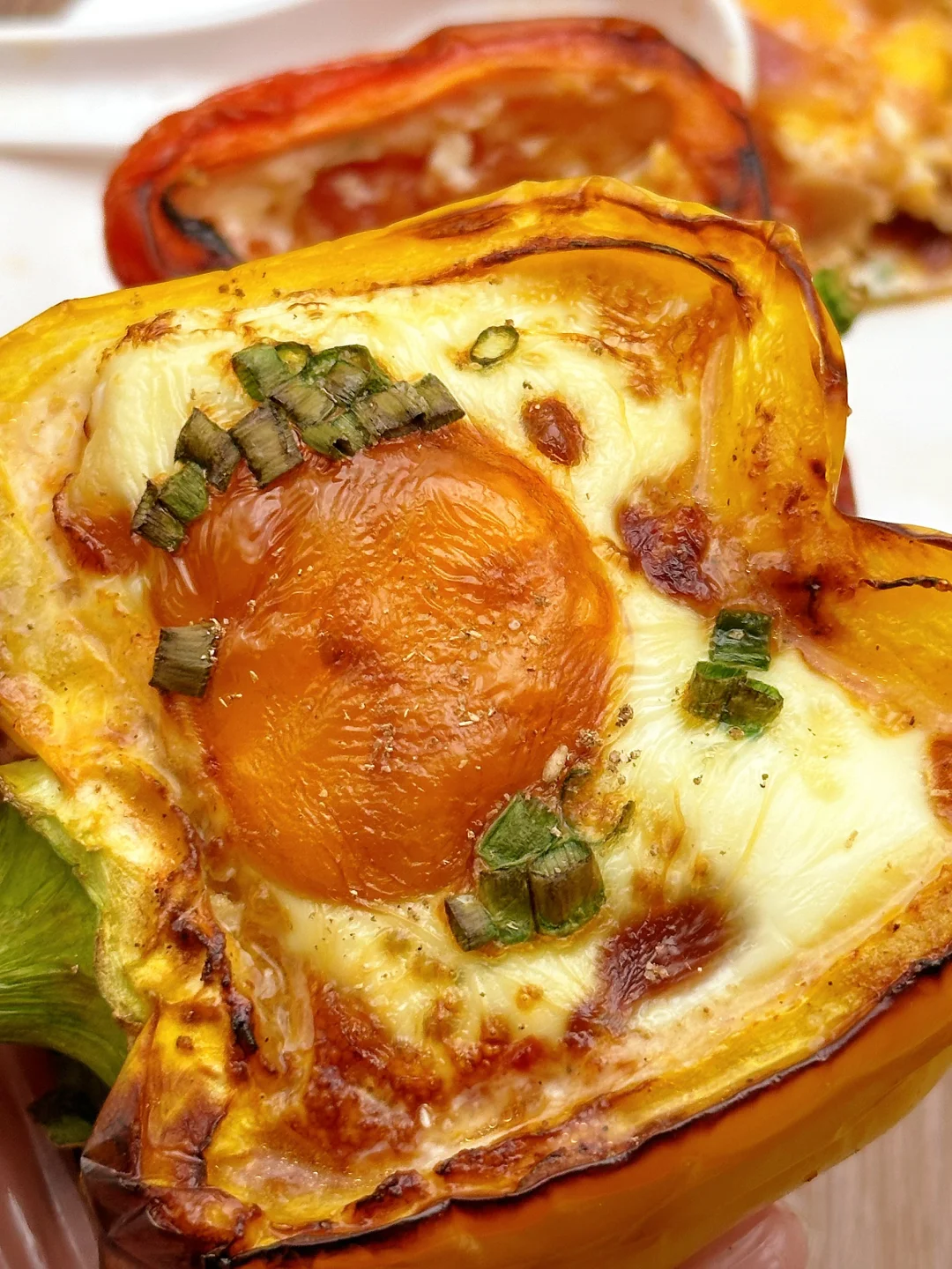 ④每个彩椒里面打入1个鸡蛋撒上葱花(不喜欢可以不放)送入空气炸锅200度20分钟。出锅就可以开吃了