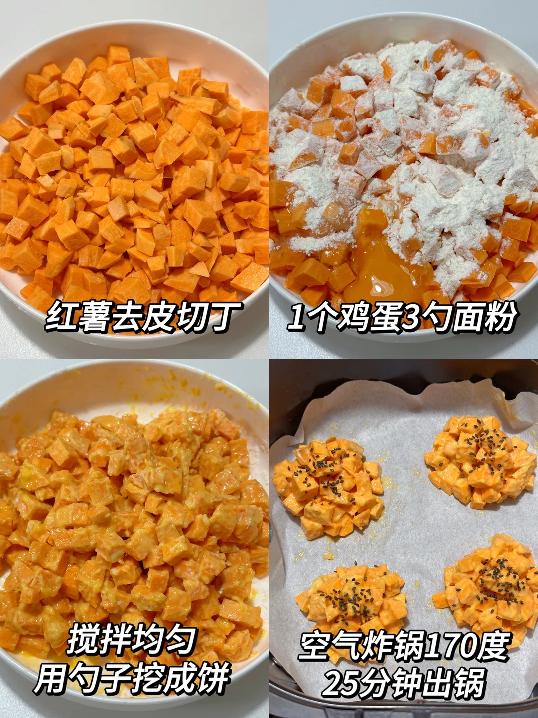 啊啊啊啊啊…姐妹们这款无油版红薯饼真的泰好吃啦,趁热吃外脆里软,香甜绵密,做法和食材都超简单,一大盘才300多卡,一个只有30多卡,减脂期也可以放心炫哟,姐妹们赶紧安排啦…… 🥗食材:红薯、鸡蛋、低筋面粉 🥘做法:如图所示~ 1⃣️红薯去皮切丁,加入1个鸡蛋、3勺低筋面粉搅拌均匀 2⃣️用勺子挖1打勺在空气炸锅盘整理成形,放入空气炸锅170度烤25分钟即可(烤的时候真的好香)[萌萌哒R]姐妹们选红薯要选甜的哟