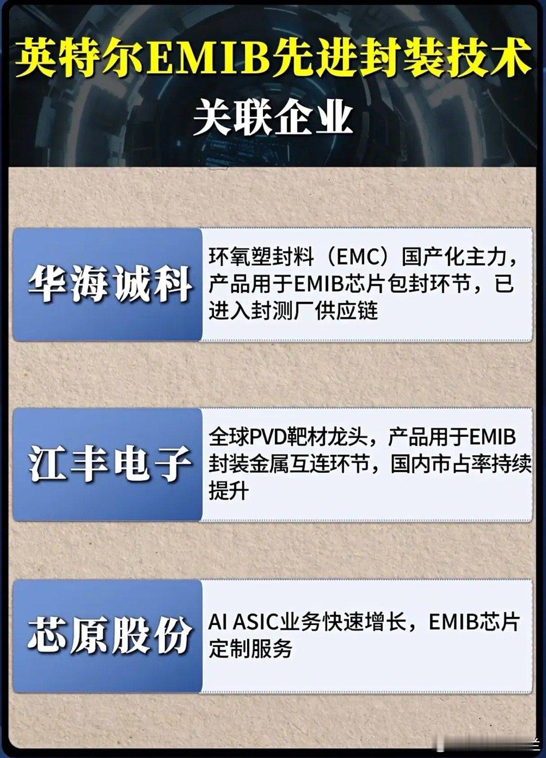 三类概念股,具体如下:一是英特尔EMIB先进封装技术关联企业。共两张图,介绍了长