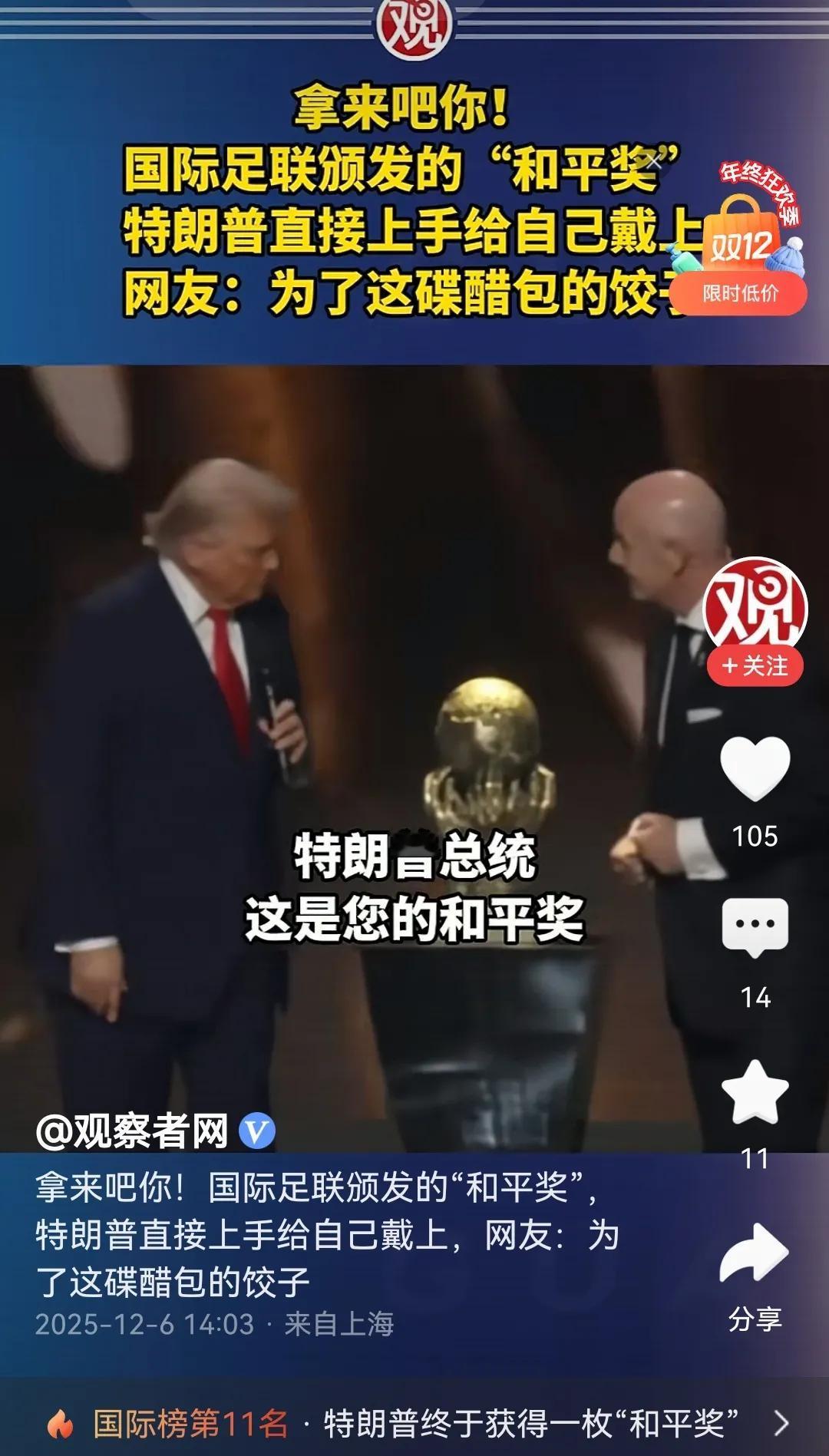 在2026年美加墨世界杯分组抽签仪式现场,有一段时间变成拍马屁环节。 国际足联今次为抽签仪式弄了一个和平奖,这奖项就是专门为特朗普而设立,国际足联主席因凡蒂诺太会来事了,在现场一直向老特献媚。 谁说外国人不讲究人情世故,起码因凡蒂诺就明白得很,讨好了特朗普,明年世界杯的各项准备工作就容易开展。 在老特看来,他是想要诺贝尔和平奖,但这和平奖也顺手拿了,沙发不给坐,找个小板凳先坐坐也行。 蚊子再小也是肉,老特才不计较那么多。