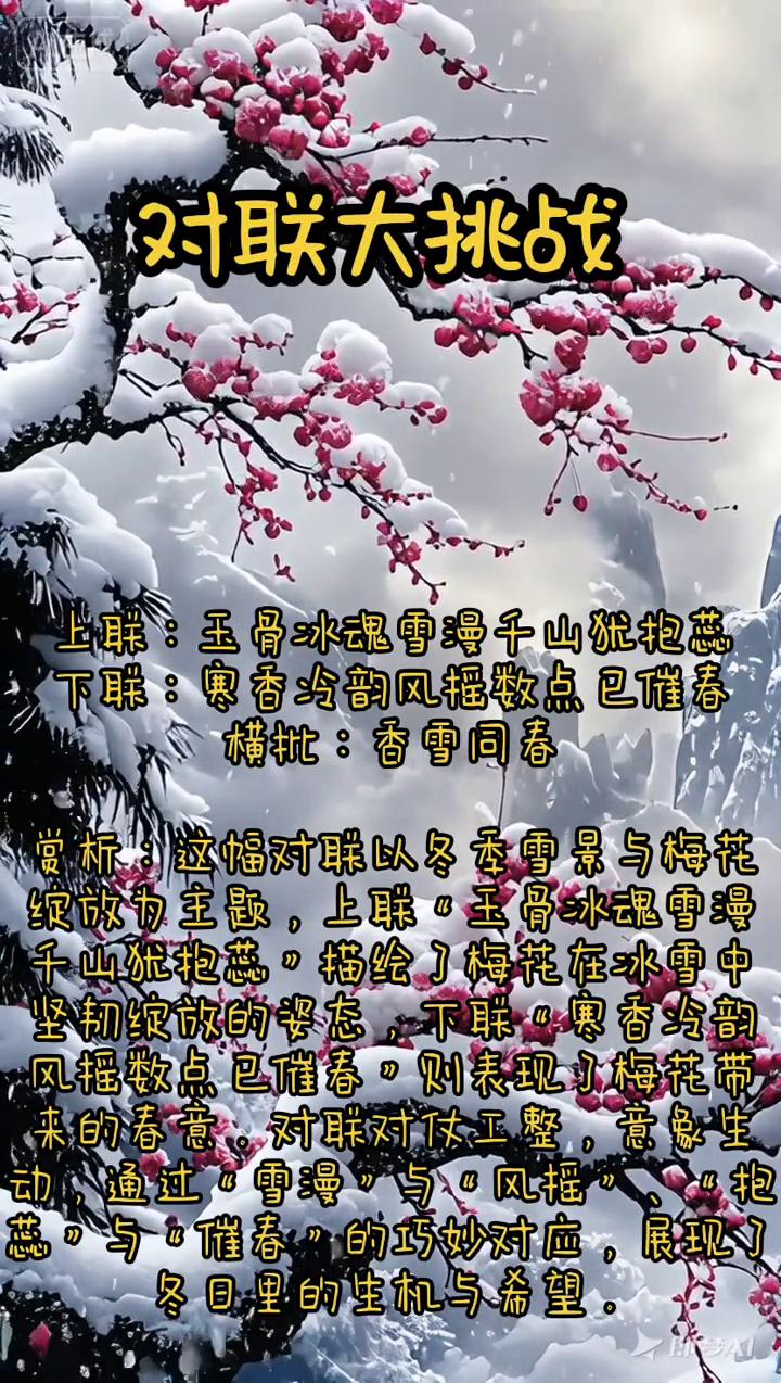 对联大挑战。 上联:玉骨冰魂雪漫千山犹抱蕊。下联:寒香冷韵风摇数点已催春。横批:香雪同春。 赏桥:这幅对联以冬季雪景与梅花绽放为主题,上联"玉骨冰魂雪漫千山犹抱蕊"描绘梅花在冰雪中坚韧绽放的姿态,下联"寒香冷韵风摇数点已催春"则表现梅花带来的春意,对联对仗工整,意象生动,通过雪漫与"风摇抱蕊,与催春"的巧妙对应,展现了冬日里的生机与希望。