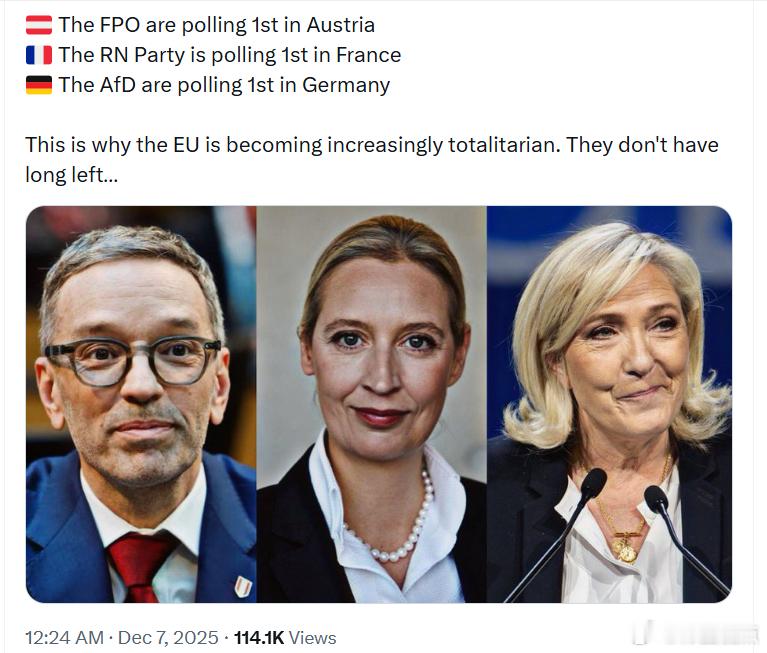 奥地利自由党(FPO)民调领先法国国民联盟(RN)民调领先德国另类选择党(AfD)民调领先这就是欧盟越来越专制的原因。他们的日子不多了……