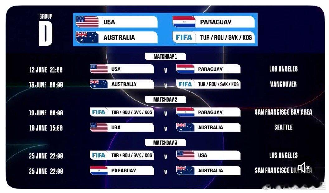 2026世界杯,美国队的第一场,对巴拉圭,6月12,在洛杉矶🇺🇸🇵🇾;第二场,对澳大利亚,6月19,在西雅图🇺🇸🇦🇺2026世界杯决赛,是7月19,在纽约/新泽西的MetLife体育场🏟️