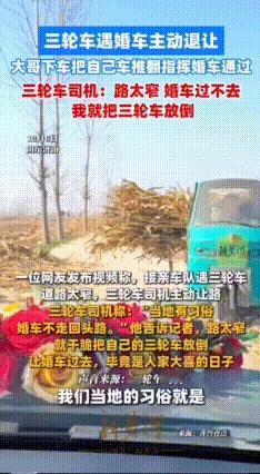 山东这位大哥火了!济南一大哥三轮车遇婚车主动退让,农村路太窄,竟直接放倒在田里让路,笑哈哈地给婚车指挥通行。 山东济南,这位大哥开了三轮车载了一车玉米杆子,开着开着遇到接亲车,当地有习俗,婚车不走回头路。大哥先是主动倒车停在路边,后发现路太窄了,推到路边,婚车还是过不了。 大哥二话不说,直接把车推倒在田里,给婚车让出路来,婚车司机见状,连忙下车递红包,握手感谢大哥。大哥笑呵呵地拿着红包,招手给婚车指挥通行。 大哥说:“当地有习俗,婚车不能走回头路,不吉利,新娘下车的时间都是规定的,不能耽误人家,结婚是大事。” 大哥的豪气和人情味让人动容,推倒车子的那一下,展示出了农村人的朴实和骨子里的善良,婚车司机回赠红包更是让这份善意得到认可,双向奔赴的善良温暖了这个寒冬。 反观此前河北拦婚车索要50条烟,逼得新娘新郎下车,改坐私家车去婚宴一事,大哥的善良和格局立见高下。 拦婚车只为沾沾喜气,大伙热闹热闹,图个喜庆,以误吉时威胁新人索要钱财的都是犯罪,结婚是大事,大哥这样有人情味的退让才是社会所需的善意,让善良得以传递。