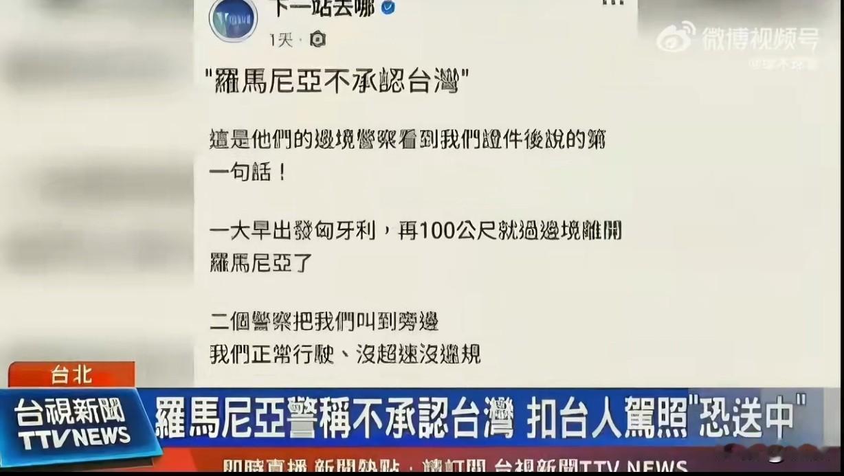 台湾省旅游博主阿勋带团自驾出行,从罗马尼亚前往匈牙利途中,距边境仅100米时被当地边境警察拦查,警方明确表示“不承认台湾”,指出台湾驾照属违法文件,持其驾车已构成刑事犯罪,没收了台湾驾照,并称将把该违法证件移交中国大使馆。