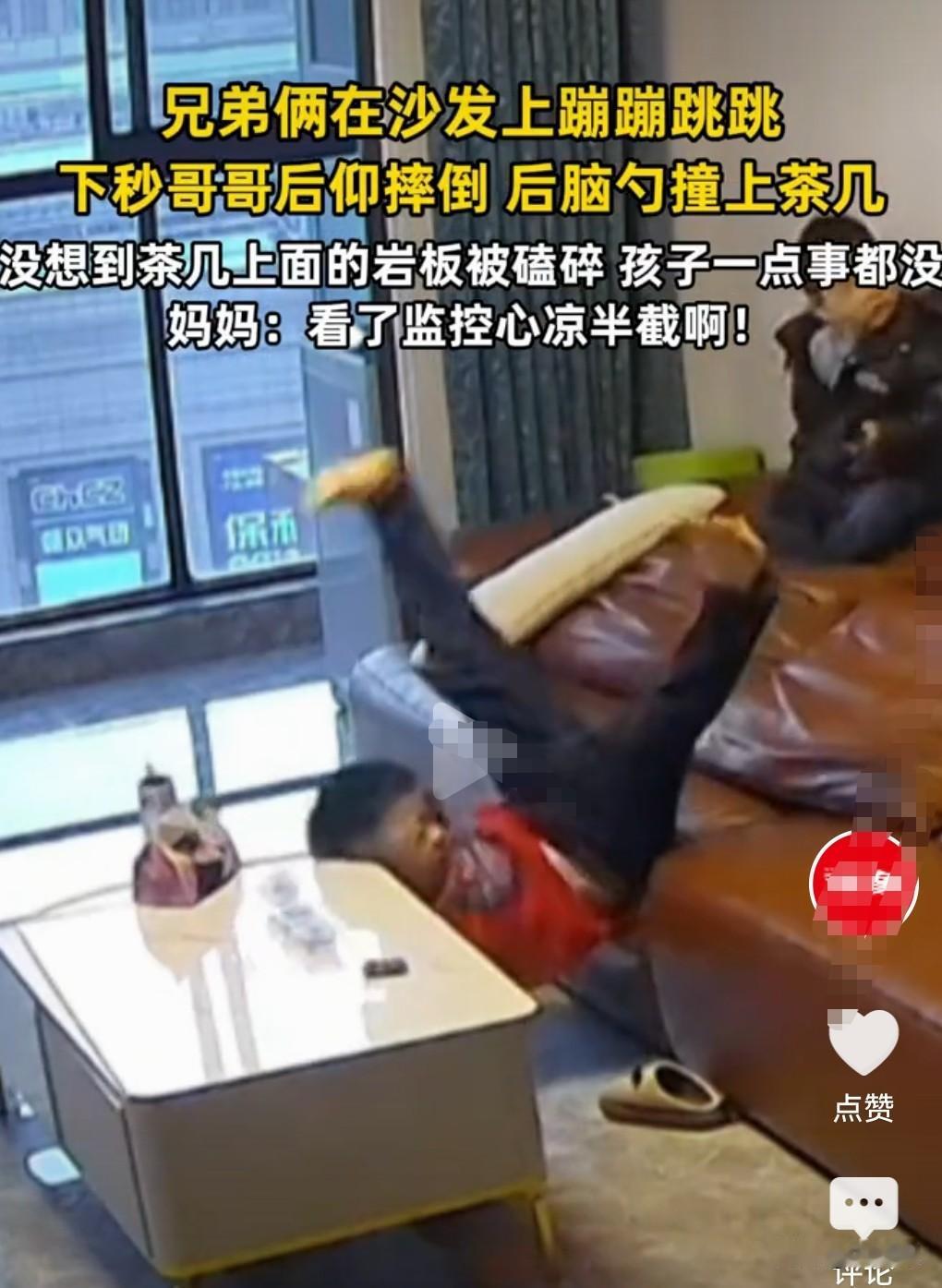 这真是敲响了警钟啊。 孩子都是非常活泼的,12月7日(发布),兄弟俩在沙发上蹦蹦跳跳。 结果有一个男孩不小心后脑勺撞到了茶几。 茶几上的岩板一下被撞碎。拍段子也是有风险的。 一男子想模仿东莞仔跨栏。 第1次跨的时候非常的潇洒啊。 结果第2次跨的时候直接摔倒在地上。 所以说少干这种危险的事情。 不是每一次都能够潇洒落地的。 男孩非常的幸运,家长说一点事也没有。 这样的行为太危险了,不是每次都这么走运的。