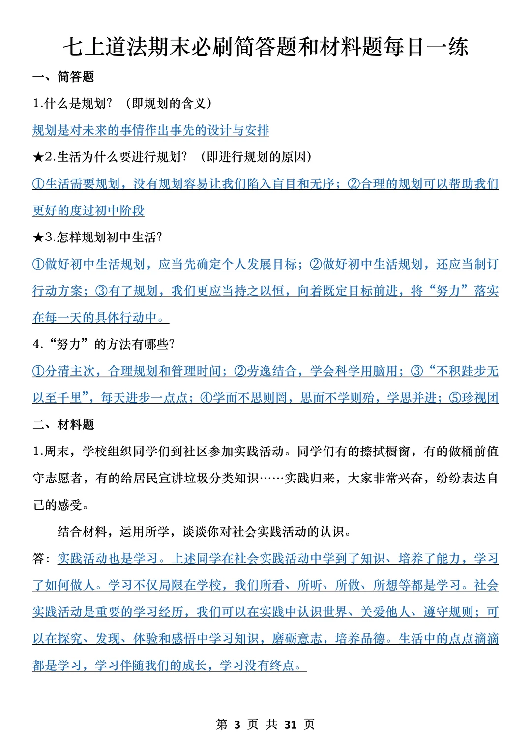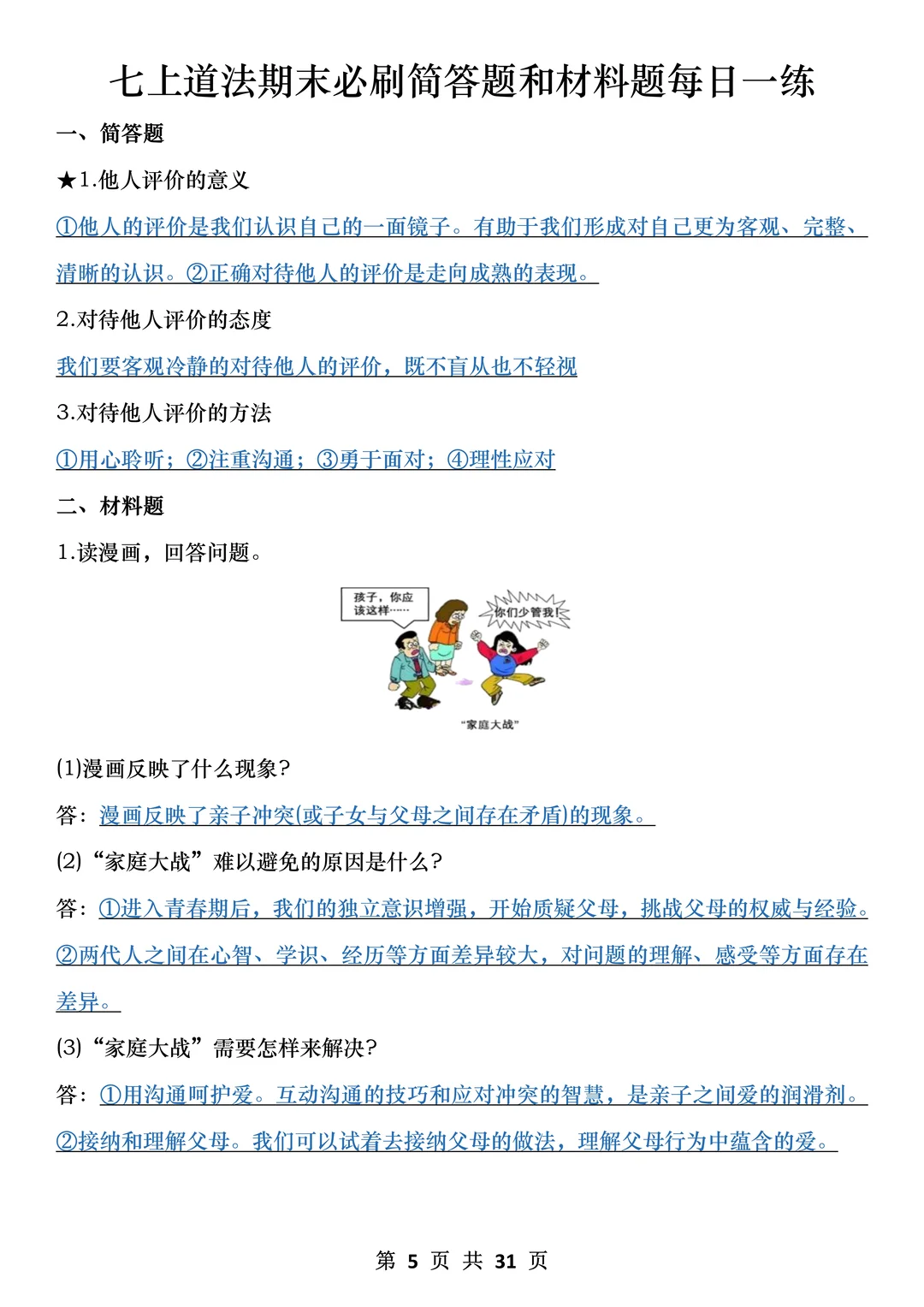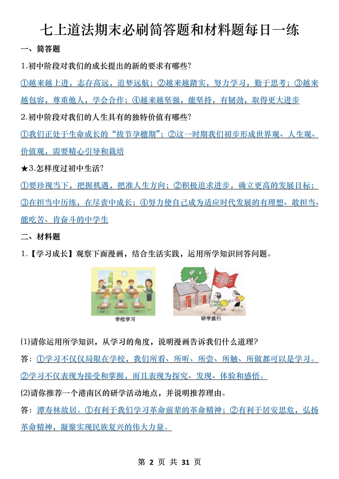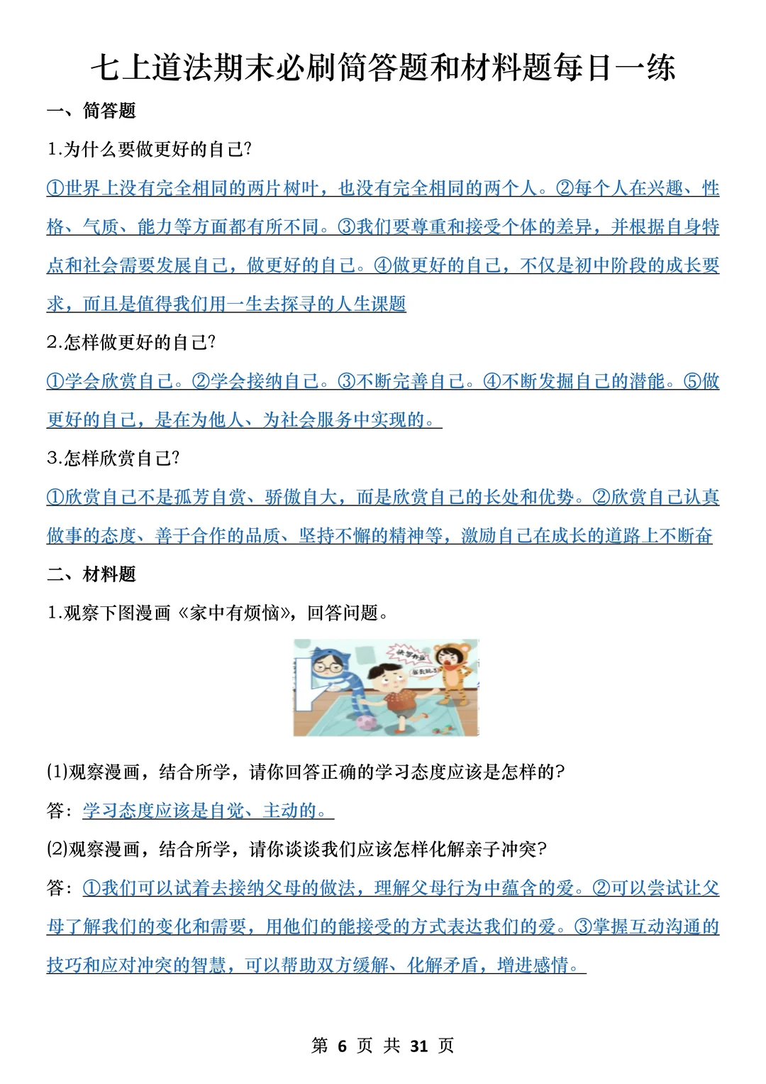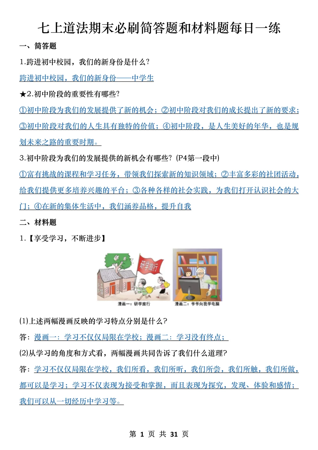 七上道法七年级上册道法初一道法每日一练提高孩子学习成绩 必考考点 辣妈育儿经 期末复习期末考试学霸秘籍