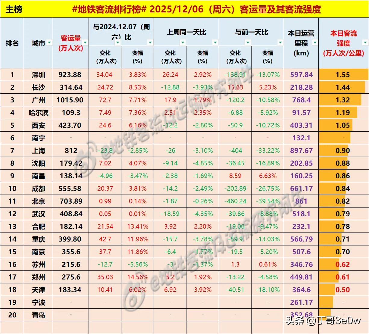 周六广州地铁客流量超千万人次成为常态,昨日份1015万多[呲牙][呲牙][呲牙] 爆料 身边事 地铁客流排行榜 中国地铁客流日报 昨日客流 排行榜 周六 广州 2025年12月6日 星期⑥ 全国重点城市轨道交通客流量排行榜: 广州:1015.90万广州地铁 深圳:923.88万深圳地铁 上海:812.00万 北京:703.89万 成都:555.58万 西安:423.70万西安身边事 武汉:408.84万武汉地铁 重庆:399.80万重庆身边事 南京:355.60万南京爆料 长沙:314.64万长沙身边事 郑州:275.60万郑州地铁 苏州:215.60万 沈阳:179.42万 天津:183.34万天津地铁 合肥:182.14万合肥身边事 南昌:138.34万南昌爆料 青岛:100万+ 南宁:100万+南宁地铁 宁波:100万+宁波爆料 哈尔滨109.30万