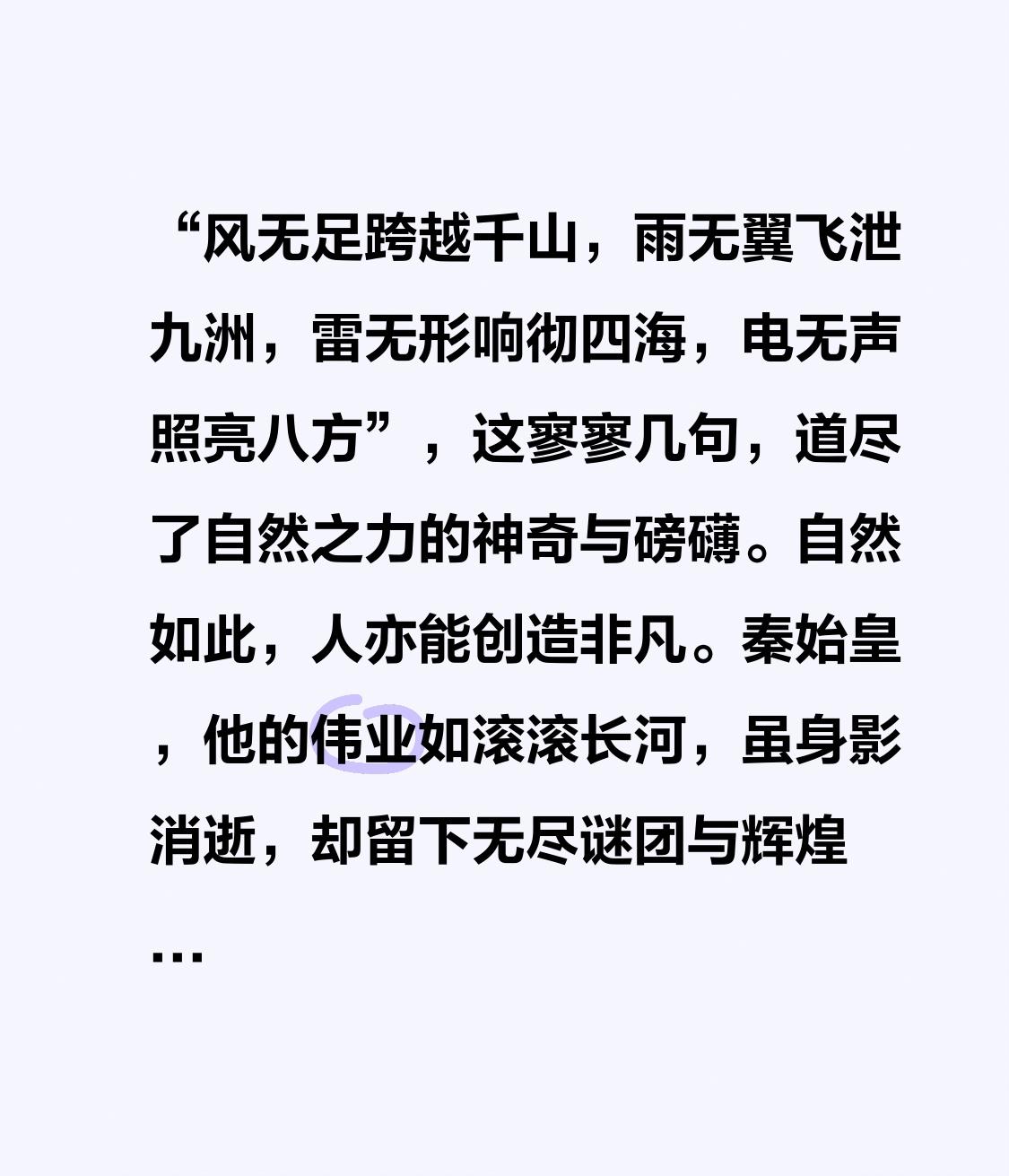 “风无足跨越千山, 雨无翼飞泄九洲, 雷无形响彻四海, 电无声照亮八方”。 这寥寥几句,道尽了自然之力的神奇与磅礴。 自然如此,人亦能创造非凡。秦始皇,他的伟业如滚滚长河,虽身影消逝,却留下无尽谜团与辉煌。他的陵墓浩浩大气,沐浴着岁月的风雨。而钱学森,“导弹之父”,以智慧与担当,让中国在军事领域威震全球。两弹爆炸,卫星上天,他的贡献如闪耀的星辰照亮八方。无论是自然的雄浑,还是人类的伟大,都在各自的领域跨越、飞泄、响彻、照亮,书写着属于自己的传奇。