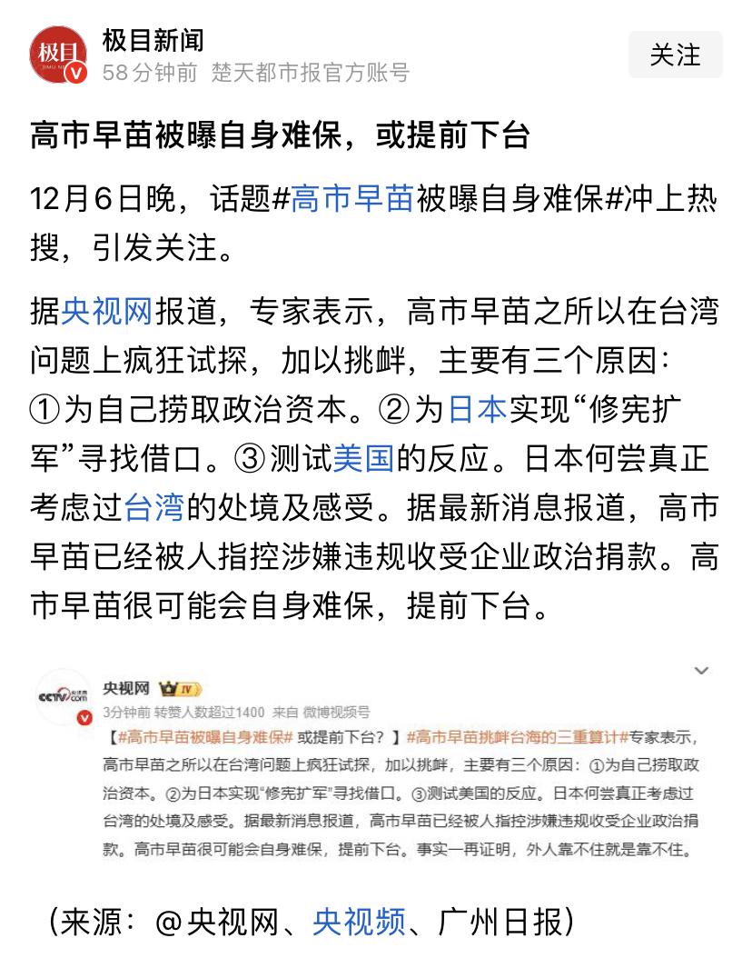 看这两个新闻,都是标题党啊[捂脸] 被题目吸引进来的,结果发现不是这回事儿。 无论是正规媒体还是自媒体,都在想象。 查了一下,高市早苗所谓违规收受企业政治捐款,在日本媒体没什么关注和报道。说违规只是一些不喜欢高市早苗群体的猜测,他们都没有证据去起诉,也没进入法律程序,高市早苗的支持率依然维持在70%左右。这事不会让她下台。 我们媒体对高市早苗的批判本意是好的,但编辑水平真的不行,无论是写文章还是发评论,都给人一种高级黑的感觉。[捂脸]可能是我们这些工作了20来年的专业媒体人太挑剔了吧?这或许也是如今新闻行业下坡路的一个缩影吧!
