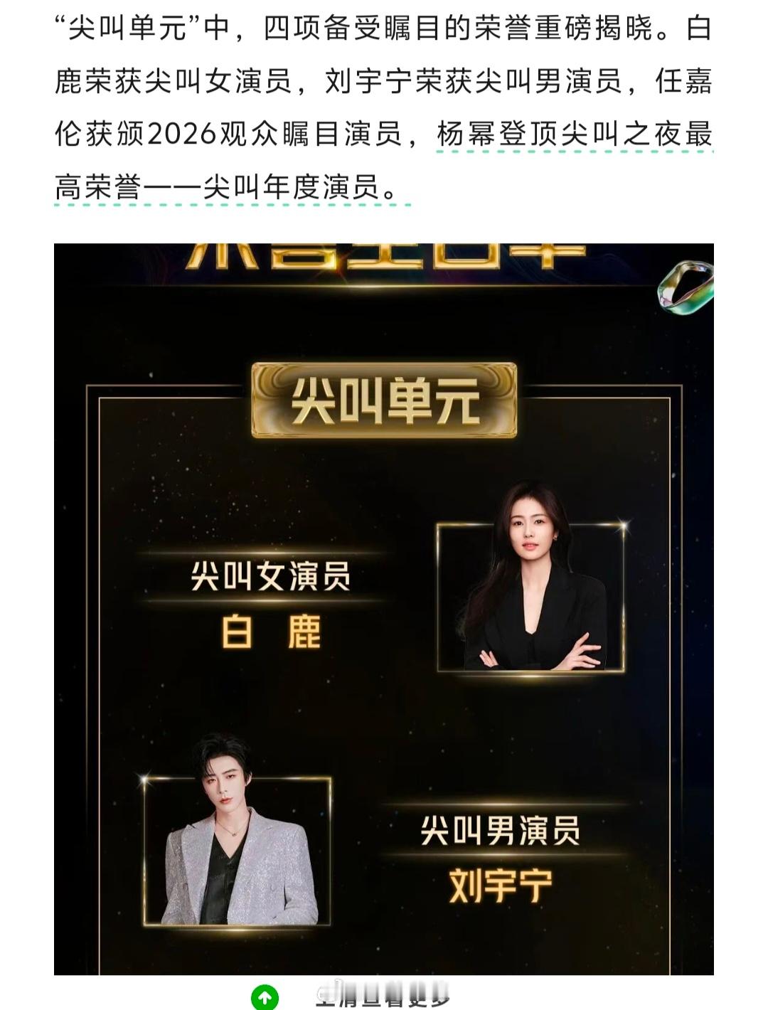 🥝尖叫之夜给的的四项荣誉:尖叫女演员:白鹿尖叫男演员:刘宇宁2026观众瞩目演员:任嘉伦尖叫年度演员(最高荣誉):杨幂
