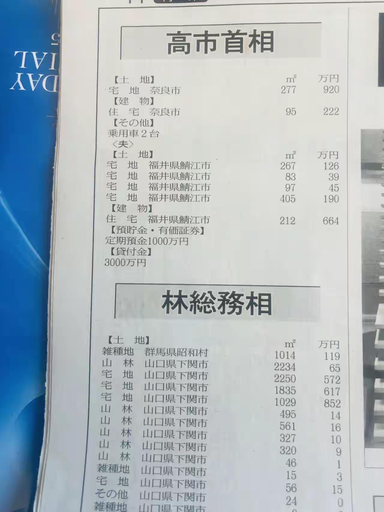 说好的日本政府清廉呢? 瞧瞧日本首相高市早苗公开的财产,财富惊人。光是房子就有几千平方米,现金也有好几千万。 日本总务大臣林方正更是夸张,名下的各类房子、林地、山林加起来多达1万多平方米,这妥妥就是大地主、大资本家做派啊!而且这还只是公开出来的,没公开的财产估计起码是这的好几倍。
