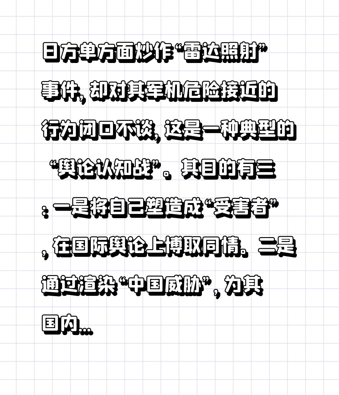 日方单方面炒作“雷达照射”事件,却对其军机危险接近的行为闭口不谈,这是一种典型的 “舆论认知战”。其目的有三: 一是将自己塑造成“受害者”,在国际舆论上博取同情。 二是通过渲染“中国威胁”,为其国内突破“专守防卫”、持续增加军费、发展进攻性武器如组建“日本版中情局”、推动武器出口等制造借口。 三是试探中方的反应底线,并为未来可能的类似摩擦预设话语权。