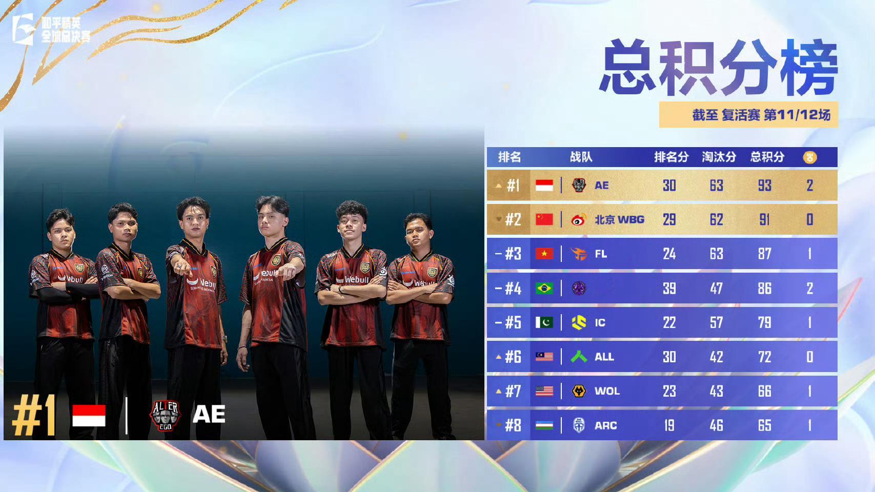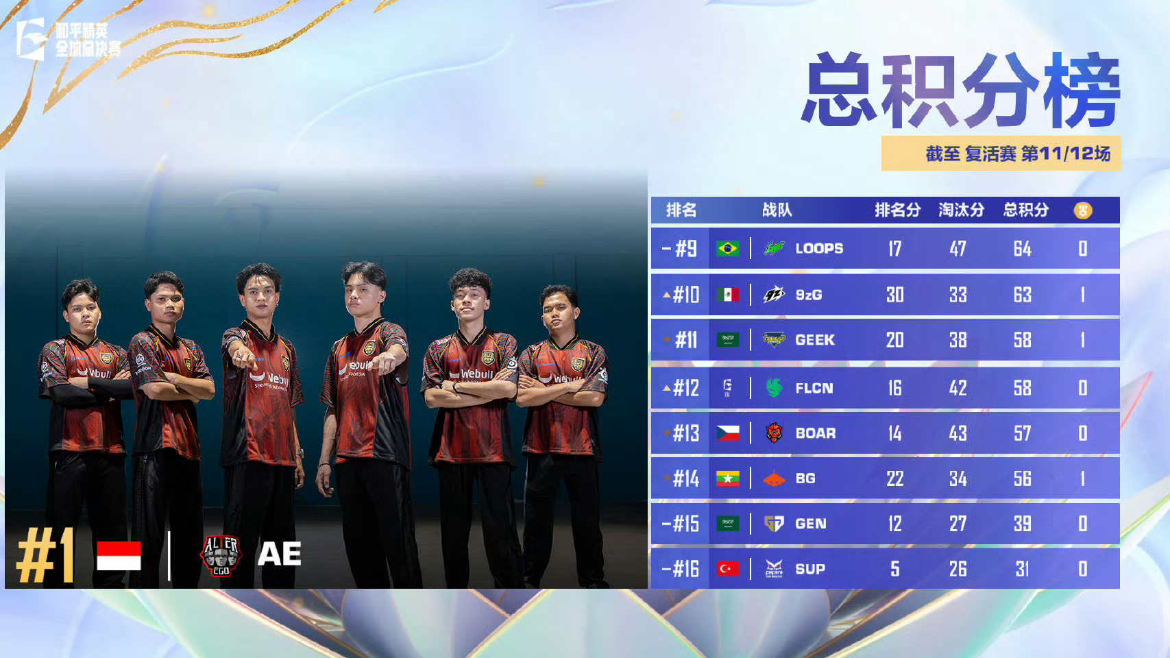 WBG复活赛背水一战WBG再战复活赛 【2025和平精英全球总决赛】复活赛 Day2 第五场 获胜队伍:9zG战队MVP:9zG·Colegoat截至本场总积分榜第—名:AE战队第二名:第三名:FL战队第四名:第五名:IC战队 截至本场淘汰榜第—名:FL·zhius 第二名:第三名:AE·Krypton 第四名:FLCN·REDOX