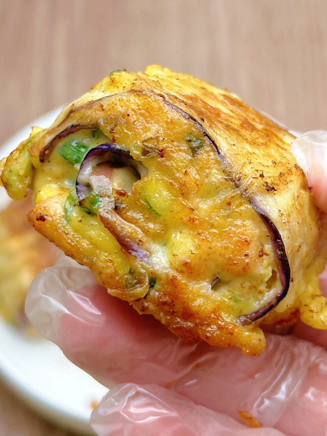 ⑤锅里少油,放入茄子卷,煎至每面金黄(最小火,多次翻面。为了热量低,少油,所以姐妹们要耐心点哟)也可以直接放入空气炸锅,喷油,180°烤8分,翻面再烤3分钟