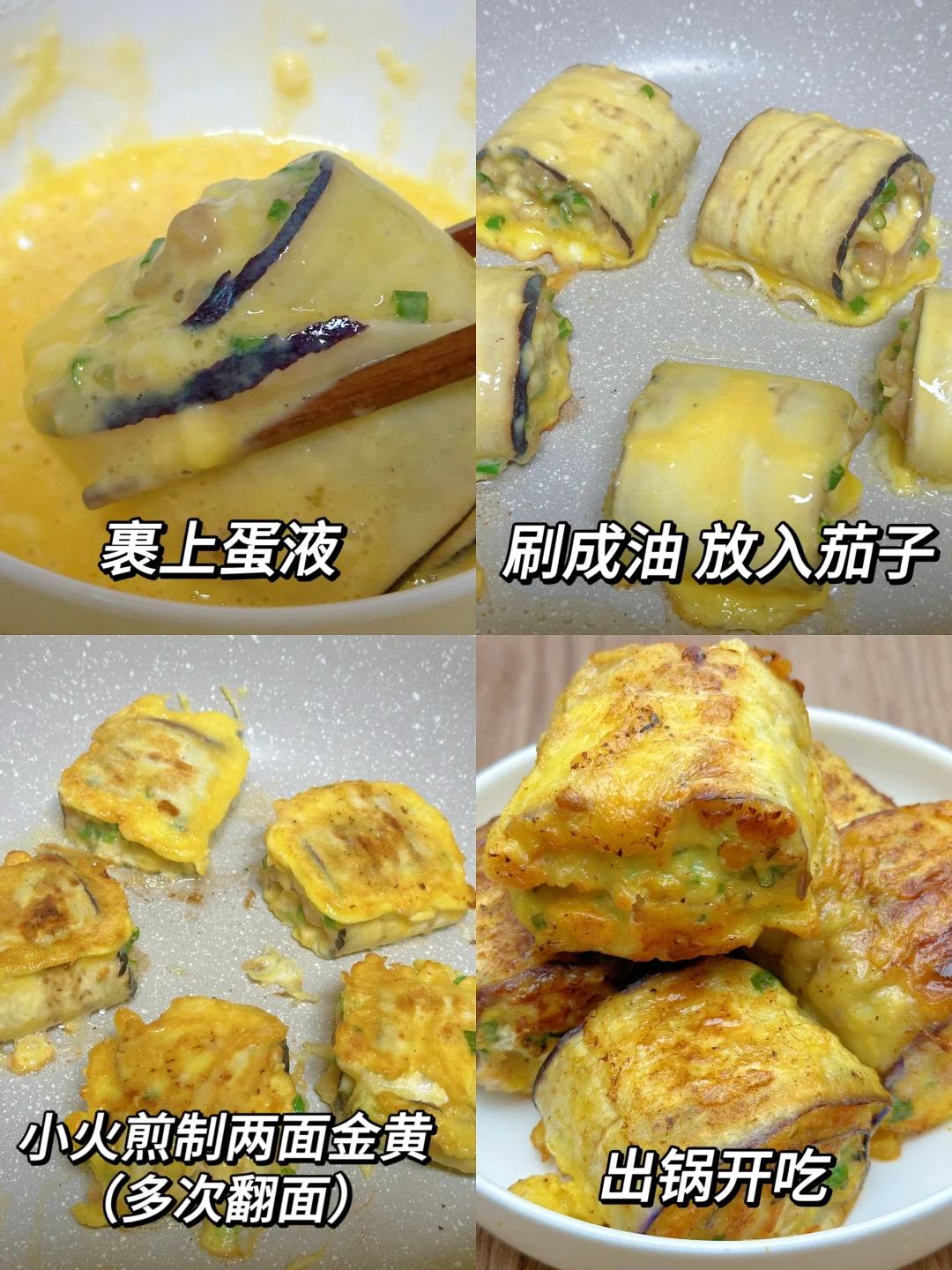 ④茄子削成薄片,铺上肉末,一个个卷起来。放入蛋液裹均匀