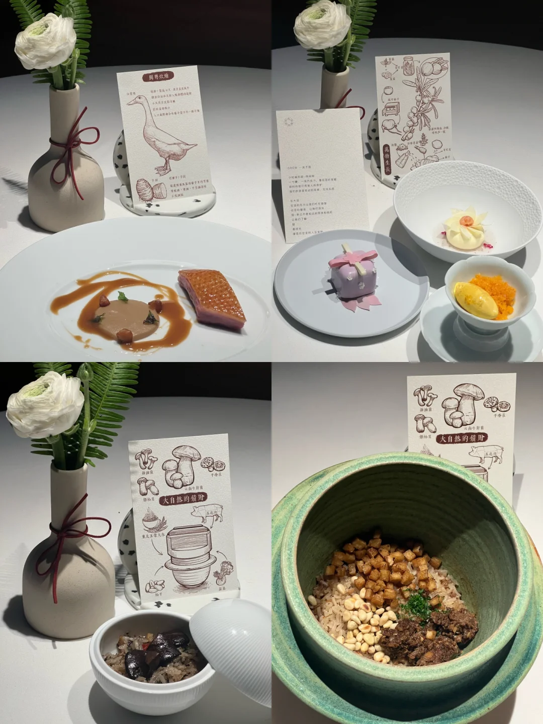 鸽烹三部曲—由鸽腿、鸽胸、鸽汤组成,鸽腿外酥里嫩,鸽胸和扇贝慕斯由土豆丝包裹,口感丰富