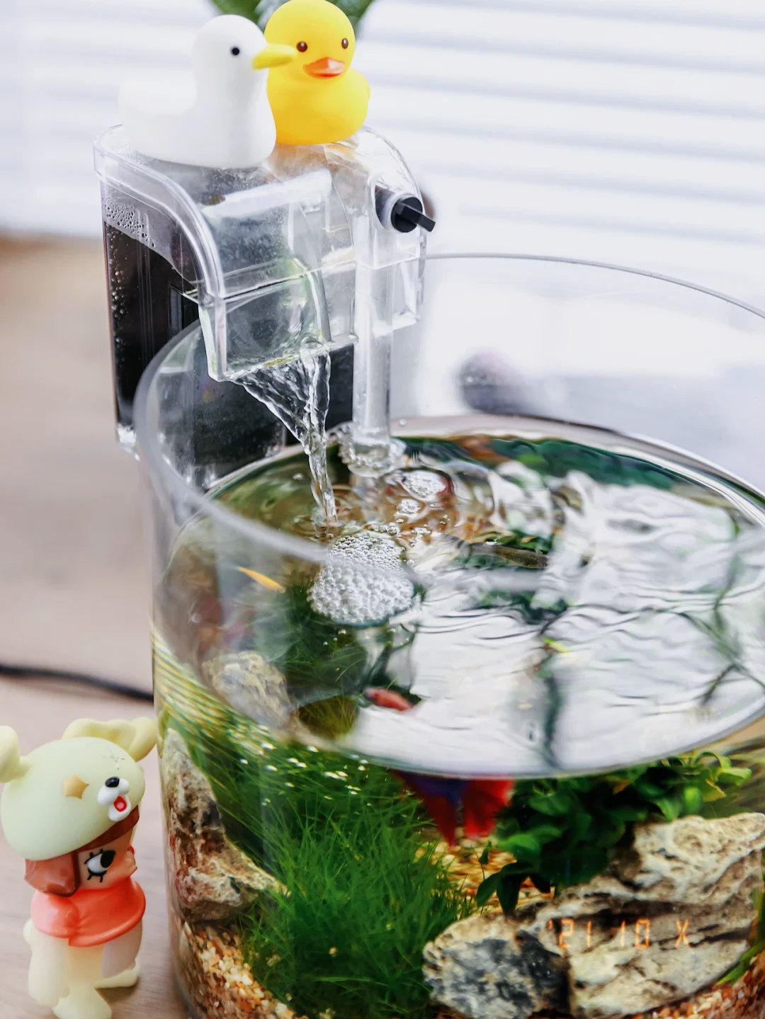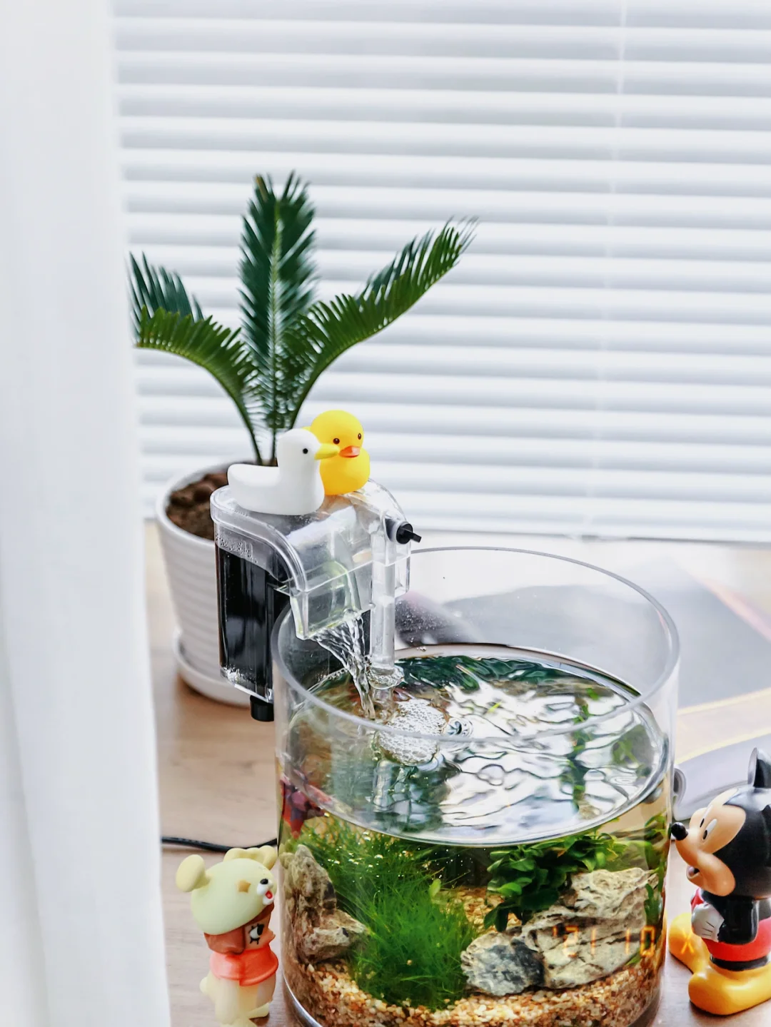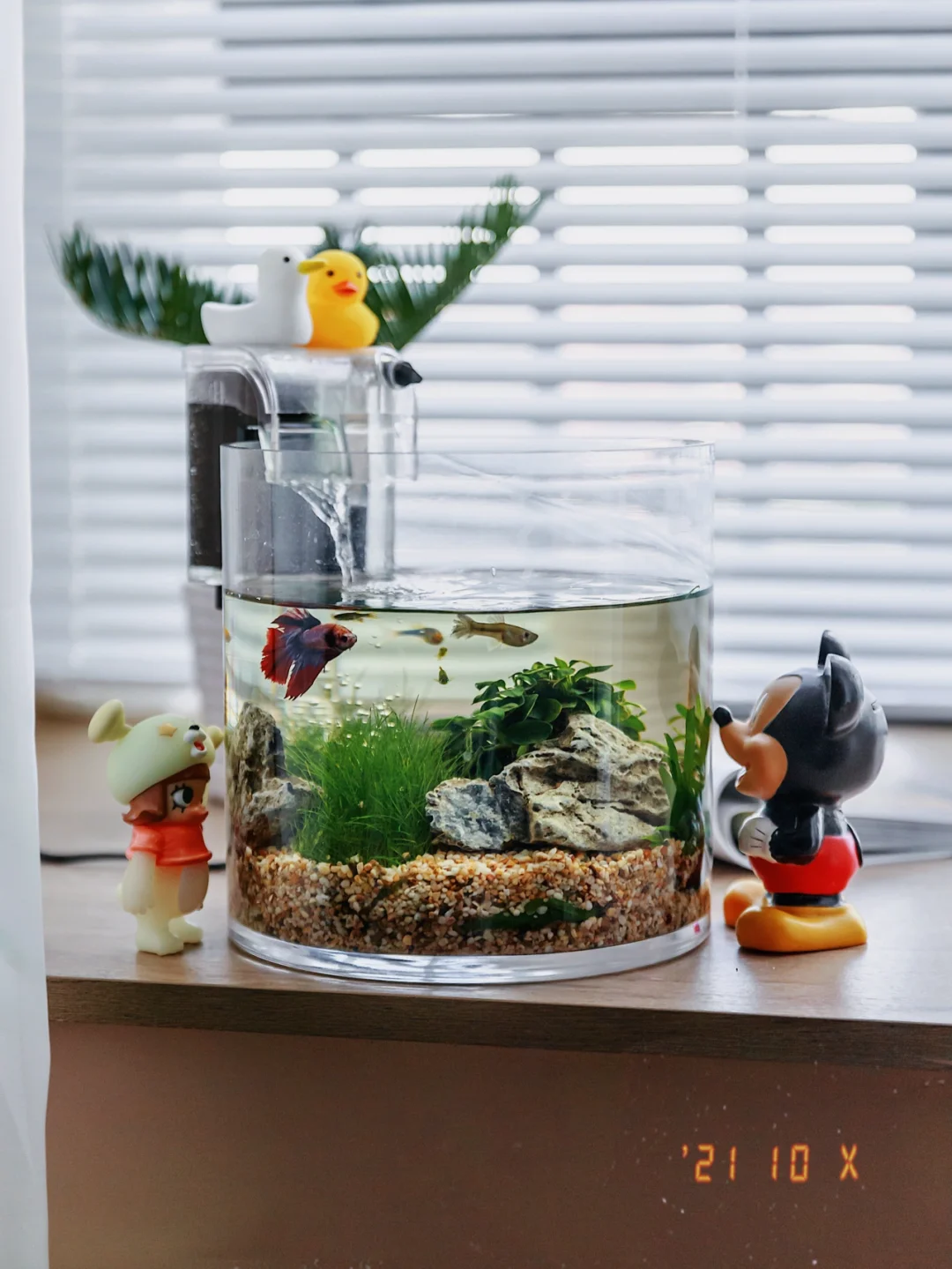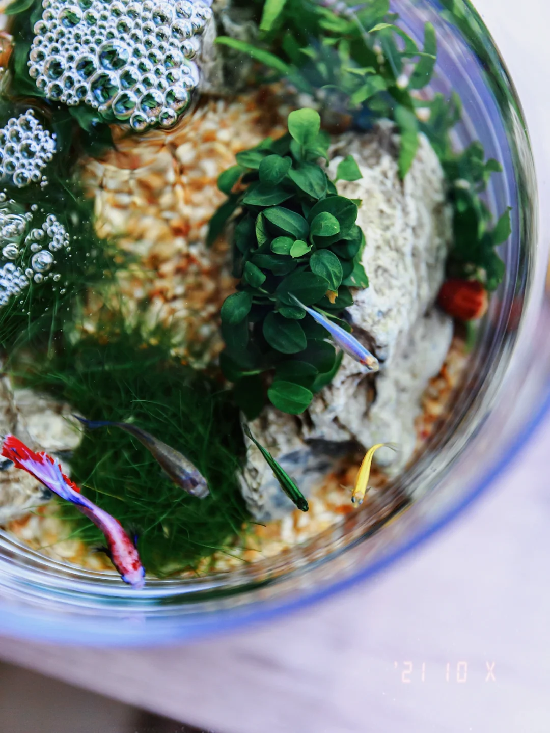 新入鱼缸养鱼后,这周终于第一次换水啦! 晒了两天的自来水,换水三分之一。 果真孔雀🦚不能与斗鱼养一起,一开始几天都相安无事,有一天早上正常喂鱼🐟时,发现一只孔雀挂了🤪🤐 尾巴被斗鱼啃的残缺不全。 - 又新入了几只彩色斑马鱼🐟,放进去时,斗鱼也会去追捕,可是斑马动作太迅捷,斗鱼碰不着,现在已经相安无事了。 - 圆形鱼缸还是挺上镜,晚上把灯打开照两个小时。 想去物色一条新的斗鱼😛