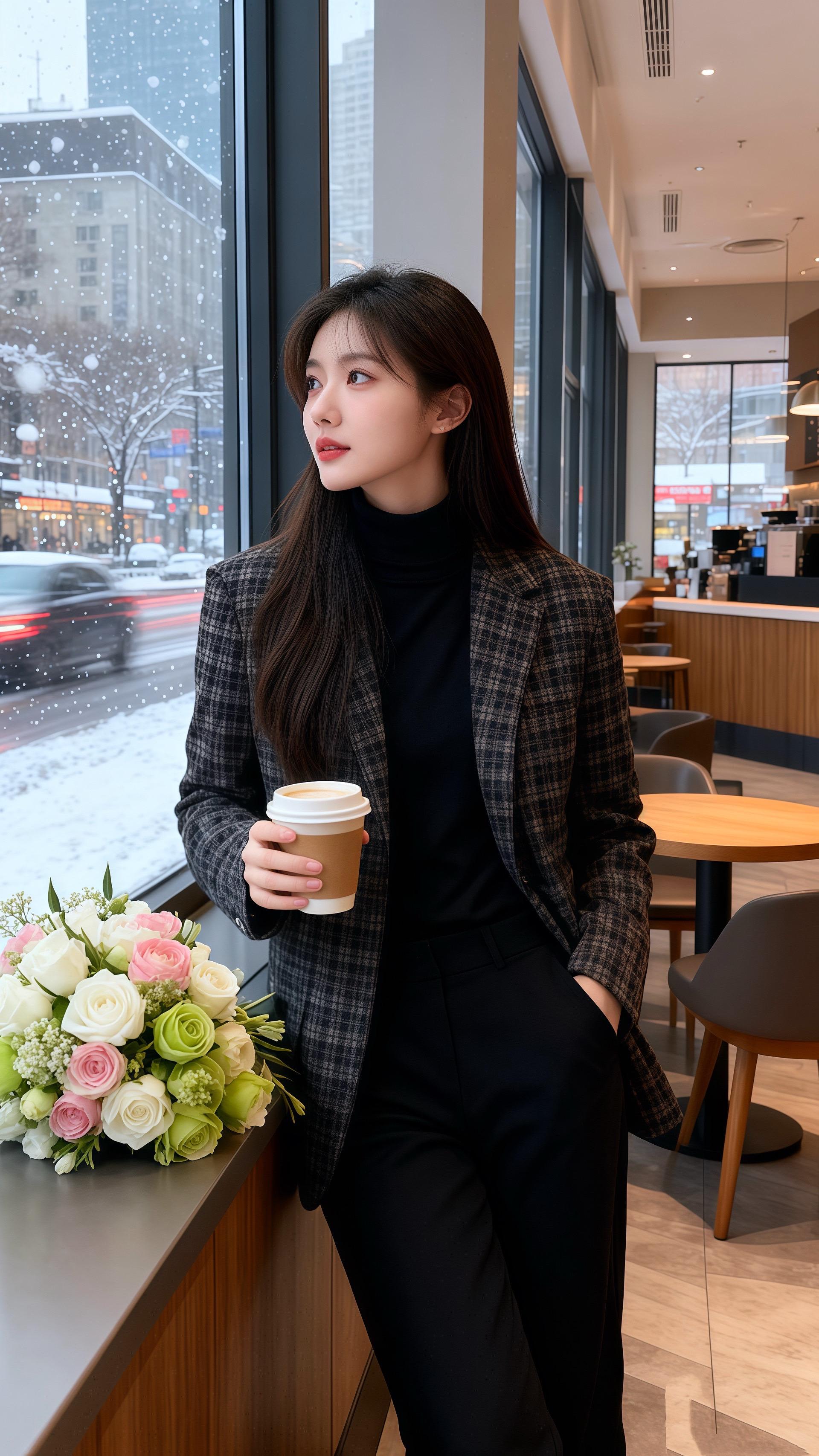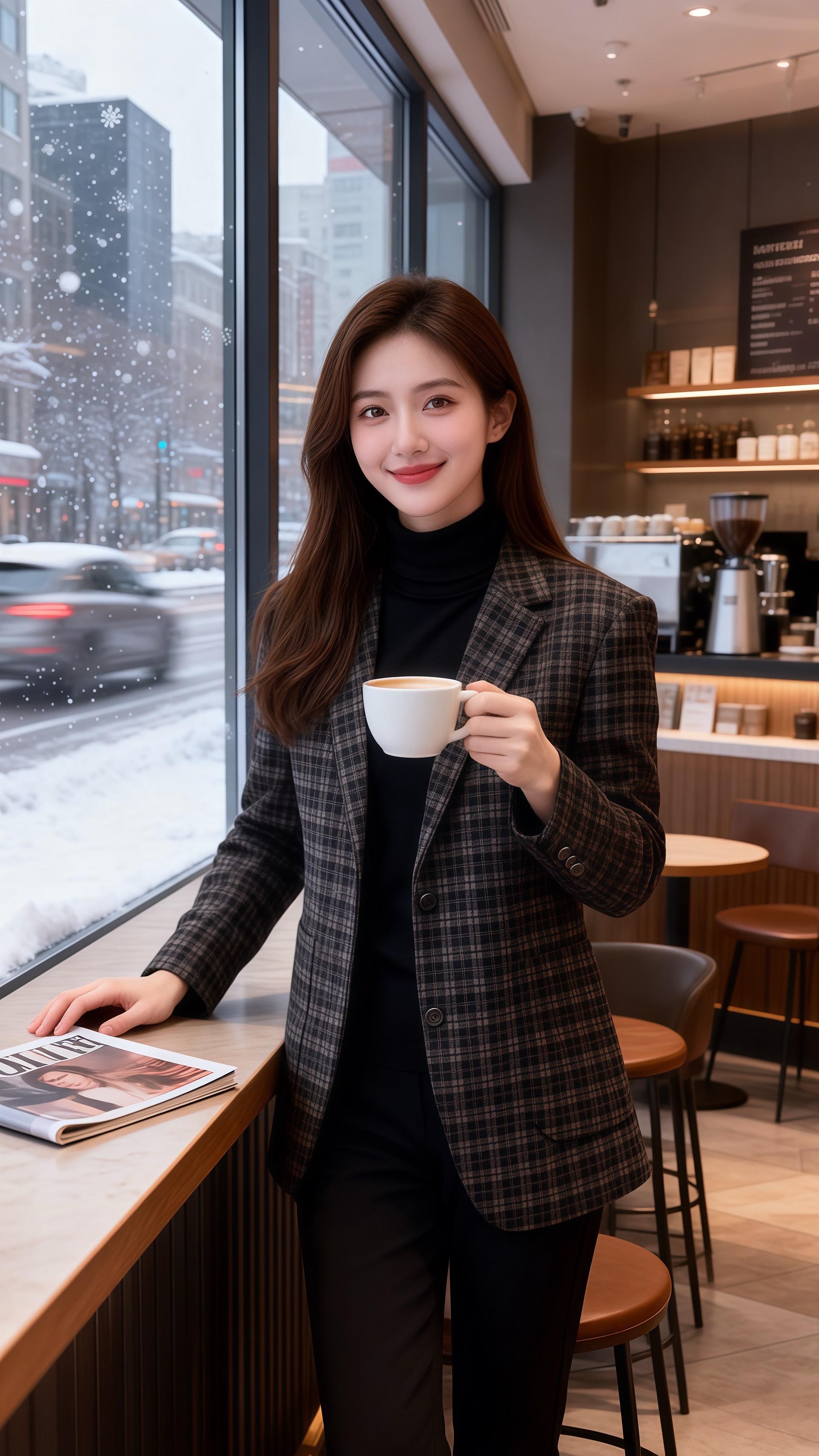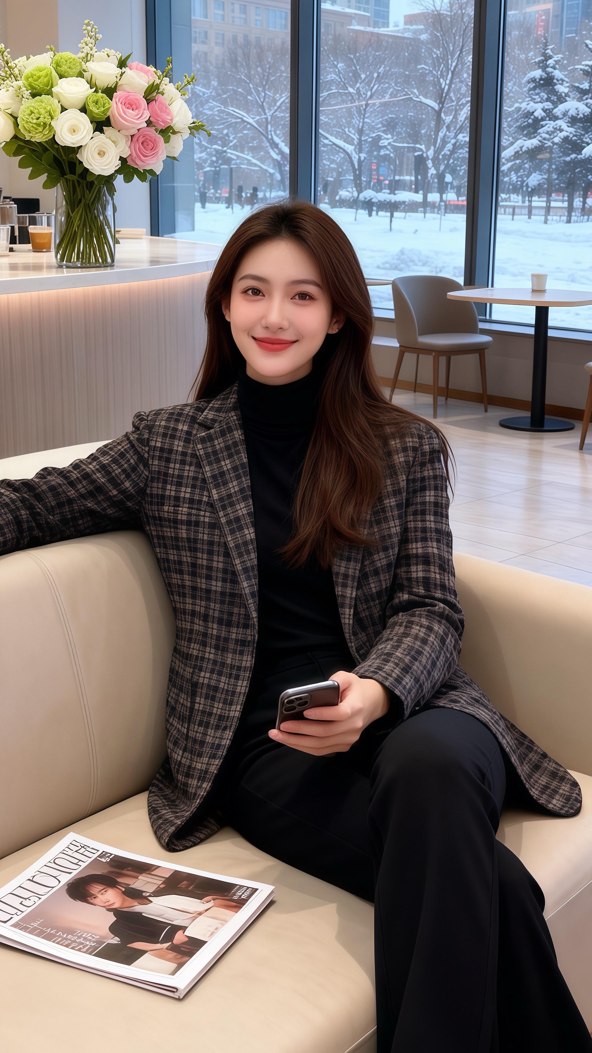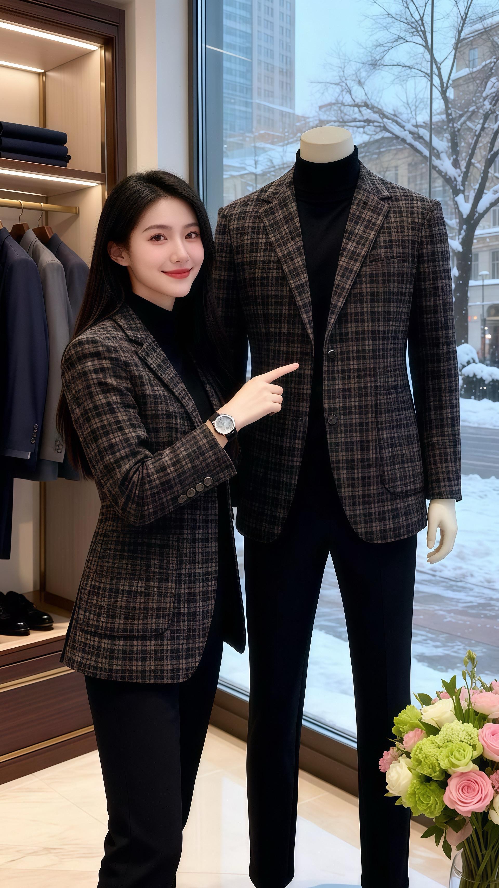 她穿黑灰格纹西装,细密的格纹纹理让衣身显得精致又有质感,翻领版型衬得肩线利落,单排扣设计简约大气。内搭黑色高领衫,贴合身形的剪裁勾勒出温婉的脖颈线条,下配黑色长裤,裤型挺括却不生硬,整身穿搭像冬日里的炭焙乌龙,沉稳的格纹糅合着黑的深邃,藏着干练又温柔的气质。