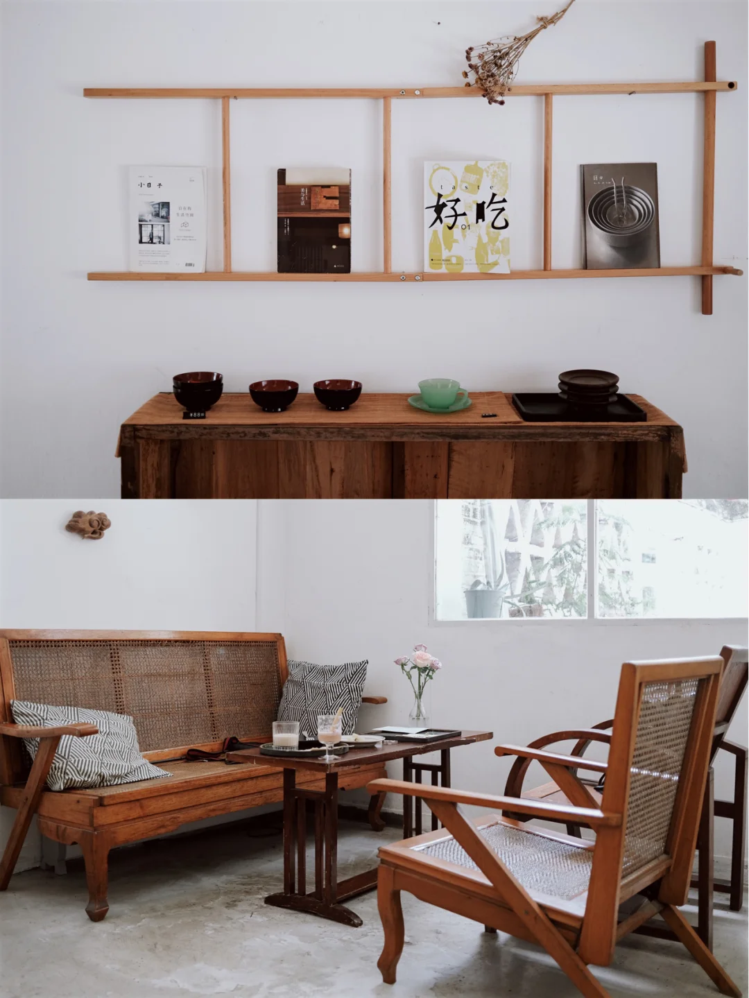 店门的区域很日剧感,懒洋洋的黑猫躺着补眠,绿植和古老的座椅静悄悄听着蝉鸣。