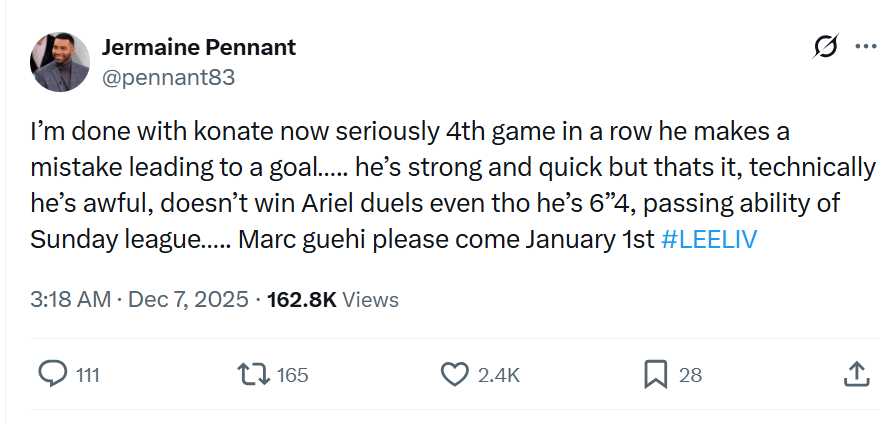 虎扑12月08日讯在此前结束的一场英超比赛中,利物浦3-3战平利兹联。前利物浦球员彭南特在社交媒体发文,批评了科纳特的表现。