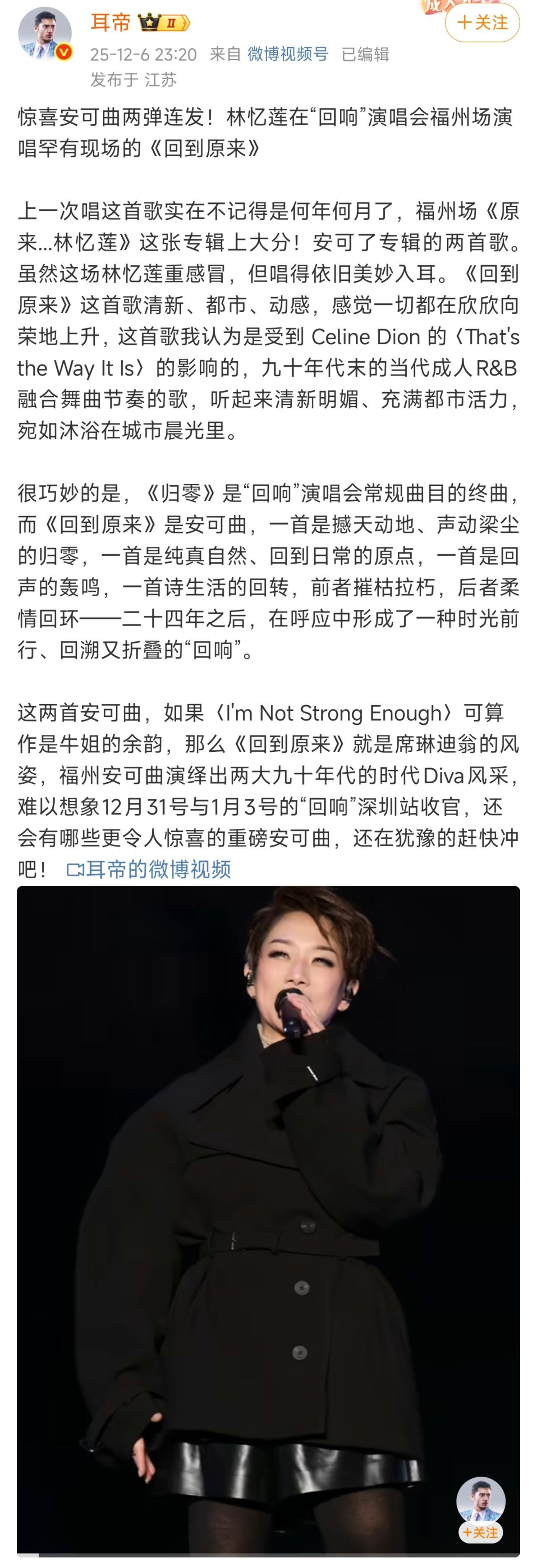 耳帝连发两篇小作文锐评林忆莲 耳帝对林忆莲福州演唱会那是爱得深沉啊!连发两篇小作文,从歌曲风格到演唱细节,狠狠夸赞,不愧是真爱粉!