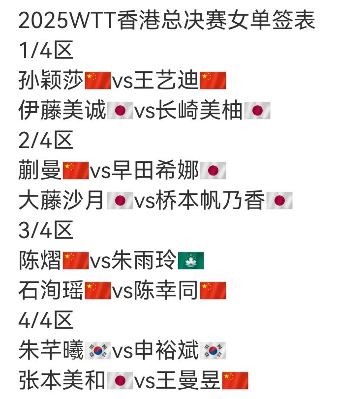 香港总决赛单打签表出来了。 男单王楚钦独守上半区,而下半区向鹏、梁靖崑、林诗栋都扎堆儿了。 女单更是神仙打架,16个人里韩国俩,澳门一个,剩下就是中日的份。 首轮5对内战,韩乒也是点背,就两人出线还首轮碰上了。 单打采用单淘汰制,男女单打一共30场比赛。